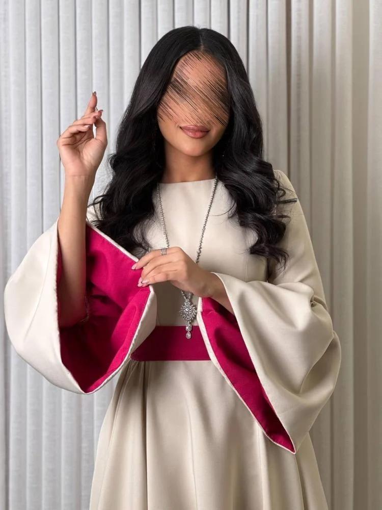 يأتي الفستان بلون أوف وايت راقٍ مع تصميم واسع وانسيابي يعزز من جمال القوام. يتميز بأكمام واسعة بلمسة كلاسيكية أنيقة، مع بطانة داخلية باللون العنابي تضيف لمسة من الفخامة. يزينه حزام خصر بلون عنابي، مما يحدد الخصر ويضفي لمسة أنثوية جذابة.