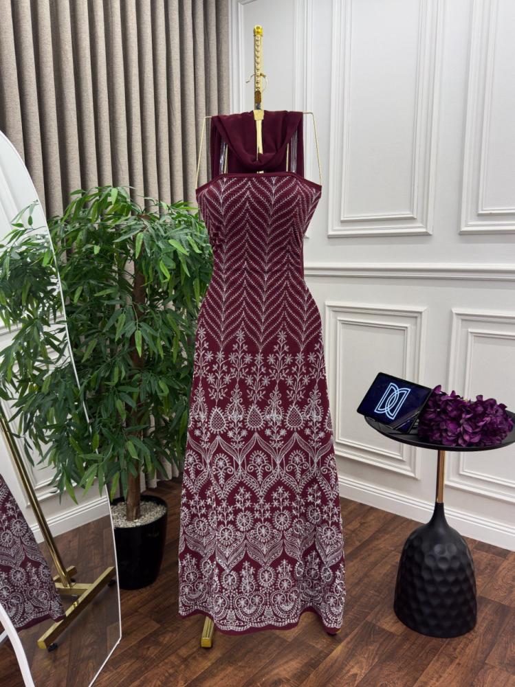 - النقوش البيضاء على اللون العنابي تضفي طابعاً تراثياً مع لمسة عصرية.