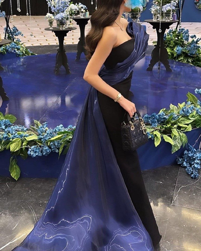 اسم الموديل/ فستان سهرة اسود مع شال كحلي لامع
