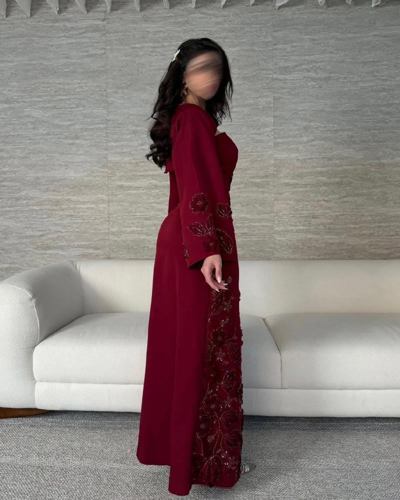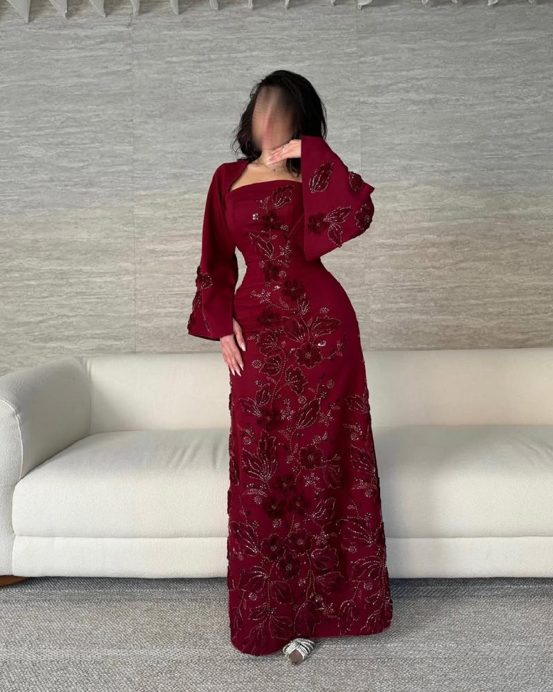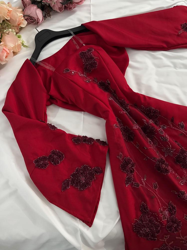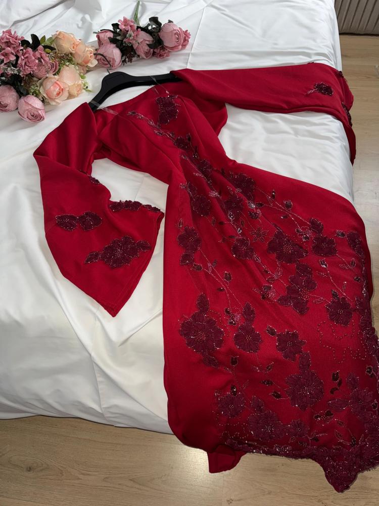 تألقي بإطلالة راقية وساحرة مع هذا الفستان الفاخر المصنوع من خامة التب الراقية، التي تضفي لمسة من الفخامة والنعومة على إطلالتك. يأتي الفستان بلون برغندي جذاب يعكس الأنوثة والأناقة، مع تصميم أنيق بقصة ضيقة تبرز جمال القوام. يتميز الفستان بأكمام واسعة مزينة بتطريزات راقية تمتد إلى كامل التصميم، مما يضفي لمسة فاخرة وعصرية. الخيار المثالي للمناسبات الفاخرة والسهرات المميزة.
