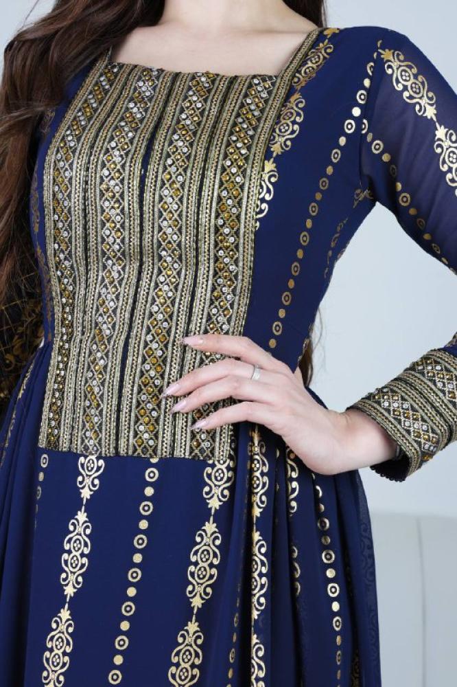 تألقي بمظهر فخم وأنيق في يوم التأسيس مع هذه الجلابية الكحلية المميزة. تم تصميمها بخامة شيفون خفيفة وراقية، تضفي لمسة من الرقي والراحة. يزين الجلابية تطريز فاخر بتفاصيل مستوحاة من التراث، ليجمع بين الأصالة والحداثة في تصميم يعكس روح يوم التأسيس. القصّة الأنيقة تعزز من جاذبيتها، لتكون الخيار المثالي لهذه المناسبة الوطنية.