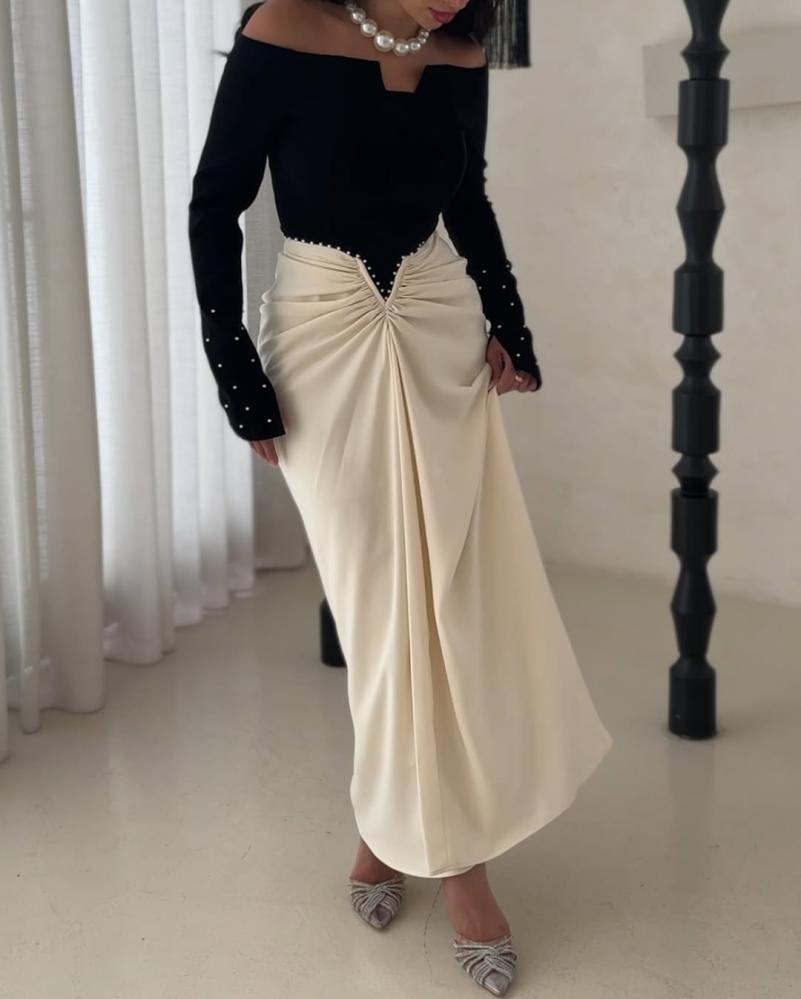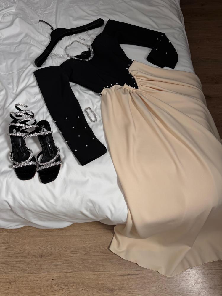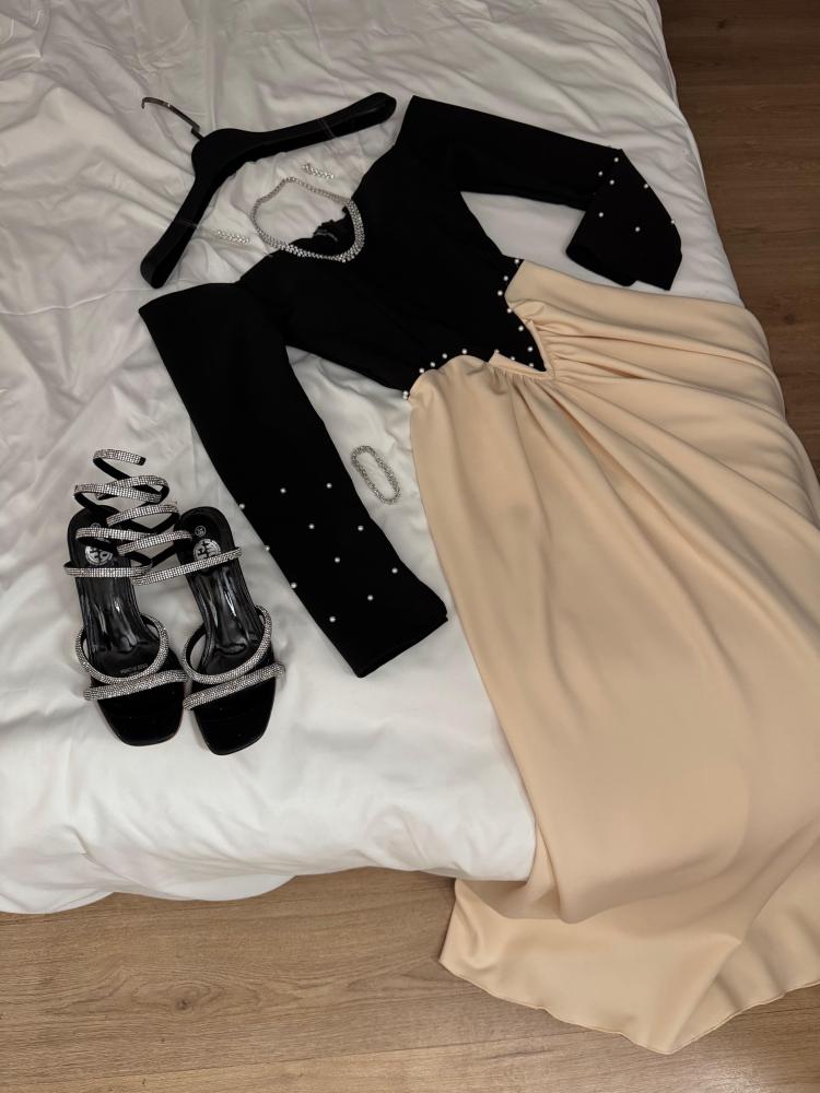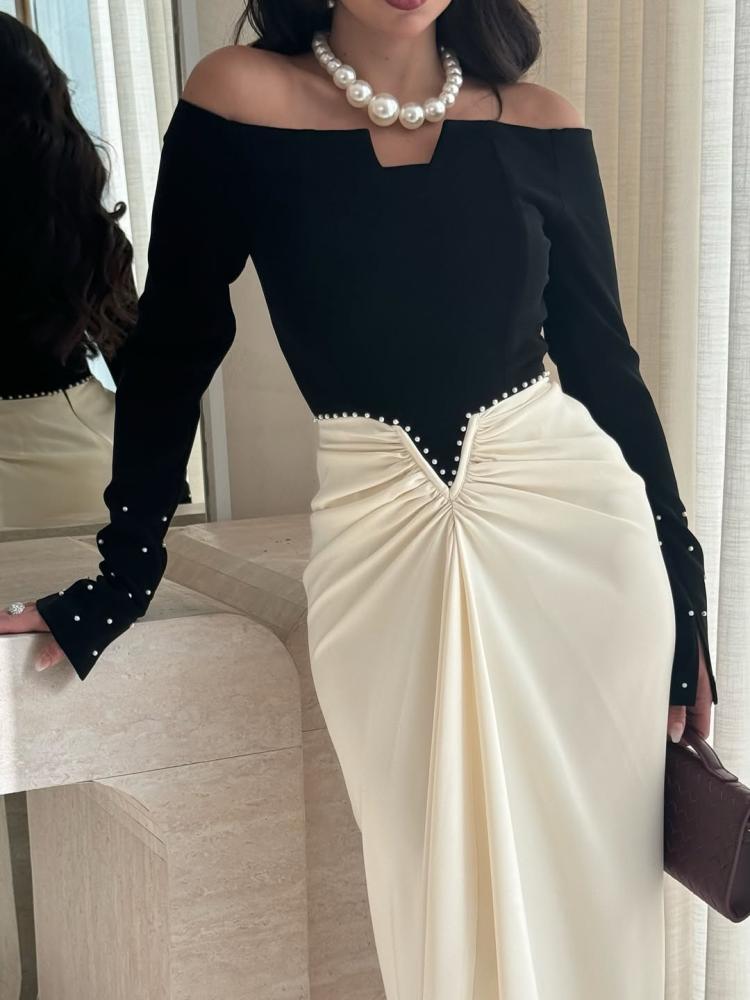 الوصف:تألقي بإطلالة فريدة مع هذا الفستان الراقي المصمم بخامة باربي الفاخرة، والذي يجمع بين الأناقة والنعومة في تصميم ثنائي اللون. يتميز الجزء العلوي بقصة أوف شولدر باللون الأسود مع تفاصيل لؤلؤية على الأكمام والحواف، بينما يأتي الجزء السفلي بقماش كريمي فاخر مطوي بشكل أنثوي يبرز جمال القوام.