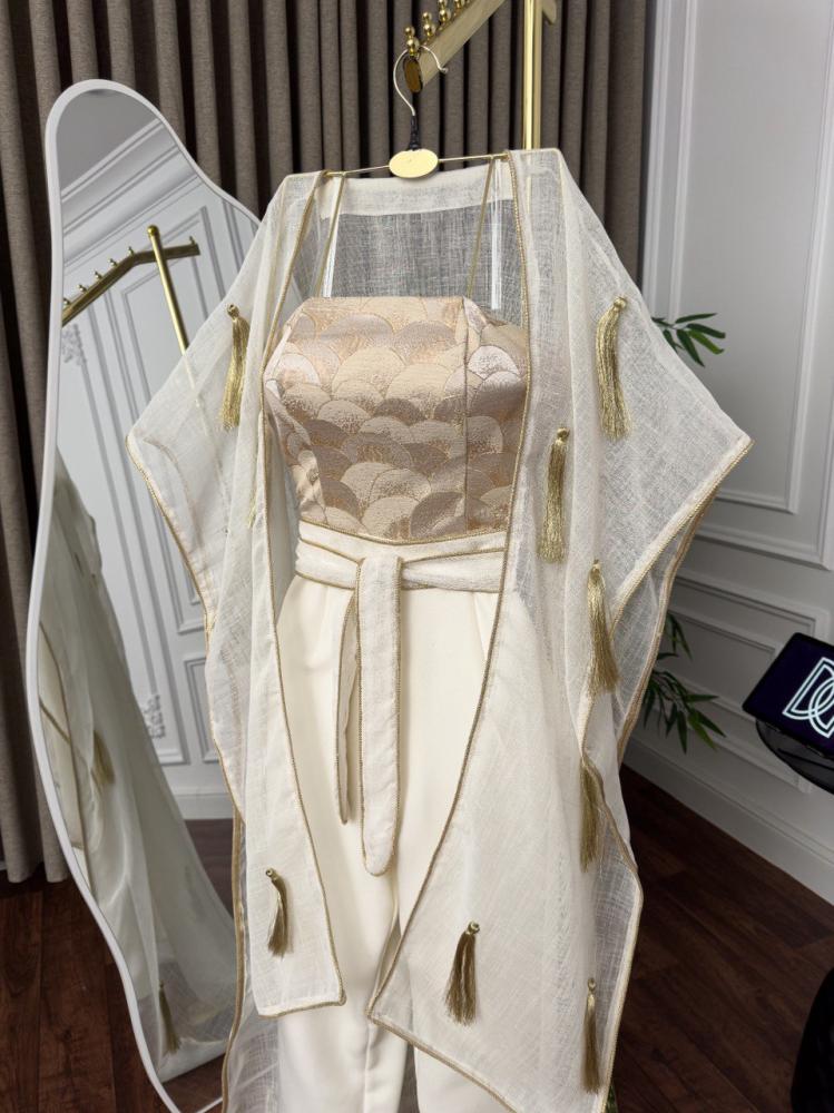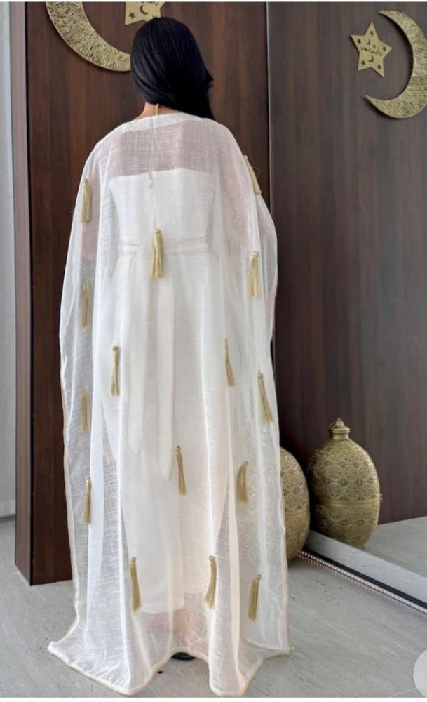 ✔ كاب طويل شفاف مزين بشراشيب ذهبية لمظهر فاخر