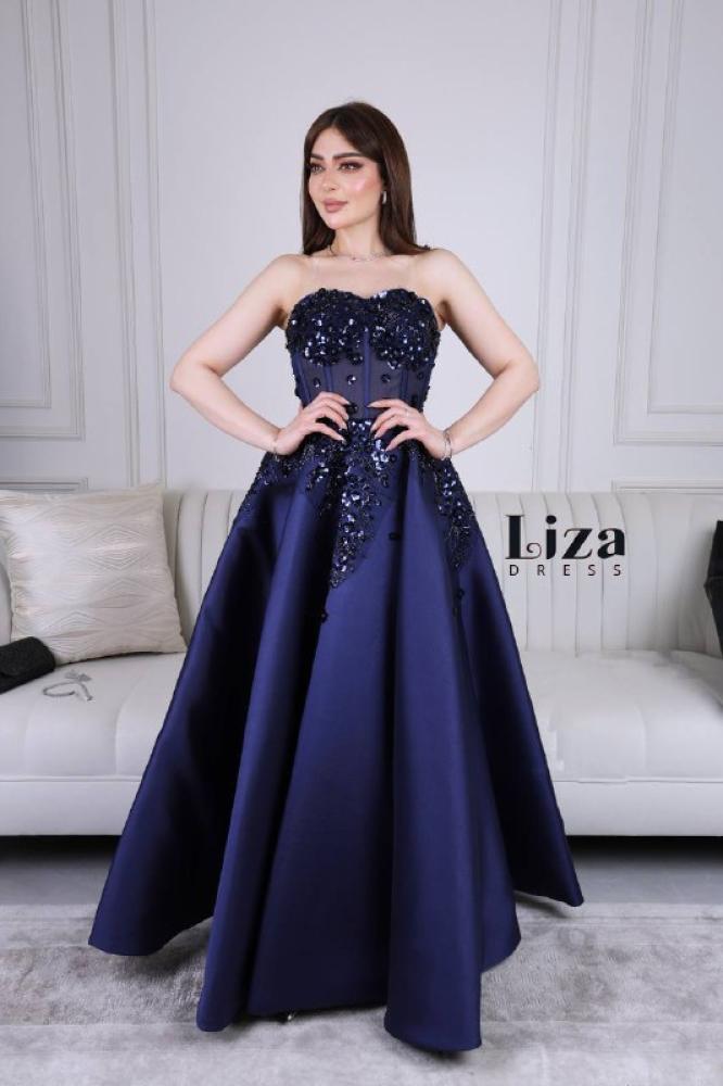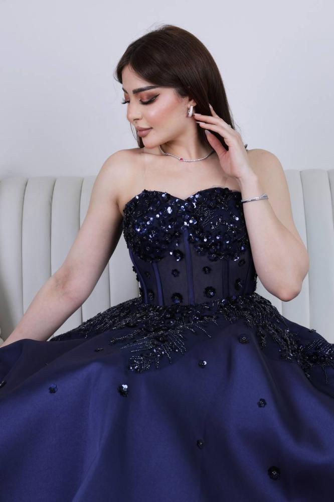 فستان أنيق وفخم بتصميم مثالي للسهرات والمناسبات الراقية. مصنوع من خامة الميكادو الفاخرة التي تتميز بلمعانها الخفيف ومتانتها، مما يمنح الفستان شكلاً راقياً ومظهراً جذاباً. يتميز بلونه الكحلي العميق الذي يبرز جمال التصميم ويضفي لمسة من الفخامة. القصة الكلاسيكية للفستان تتسم بالخصر الضيق والتنورة الواسعة التي تعزز من جمال القوام. يتميز الفستان بتطريز فاخر على منطقة الصدر، مما يضيف له طابعاً فريداً من الأناقة.