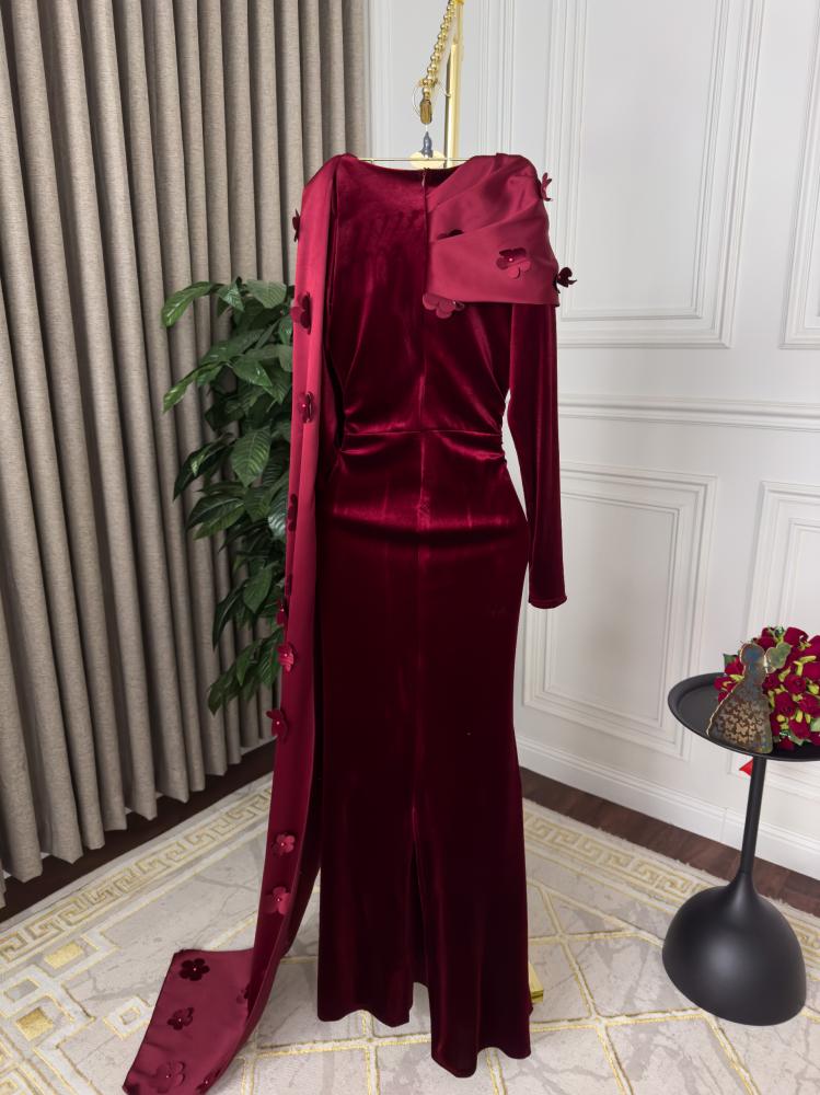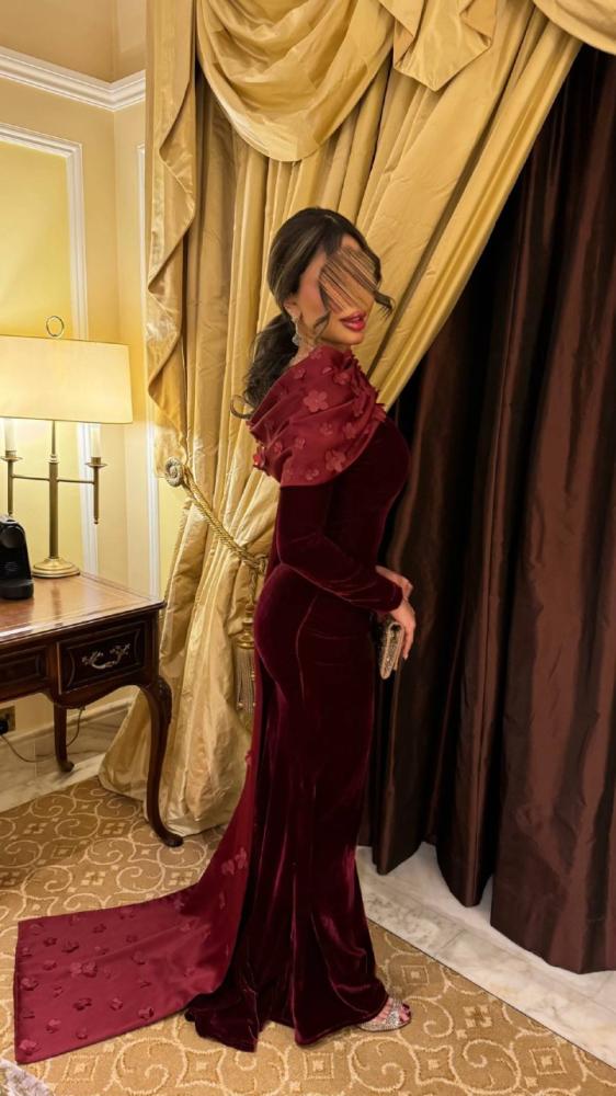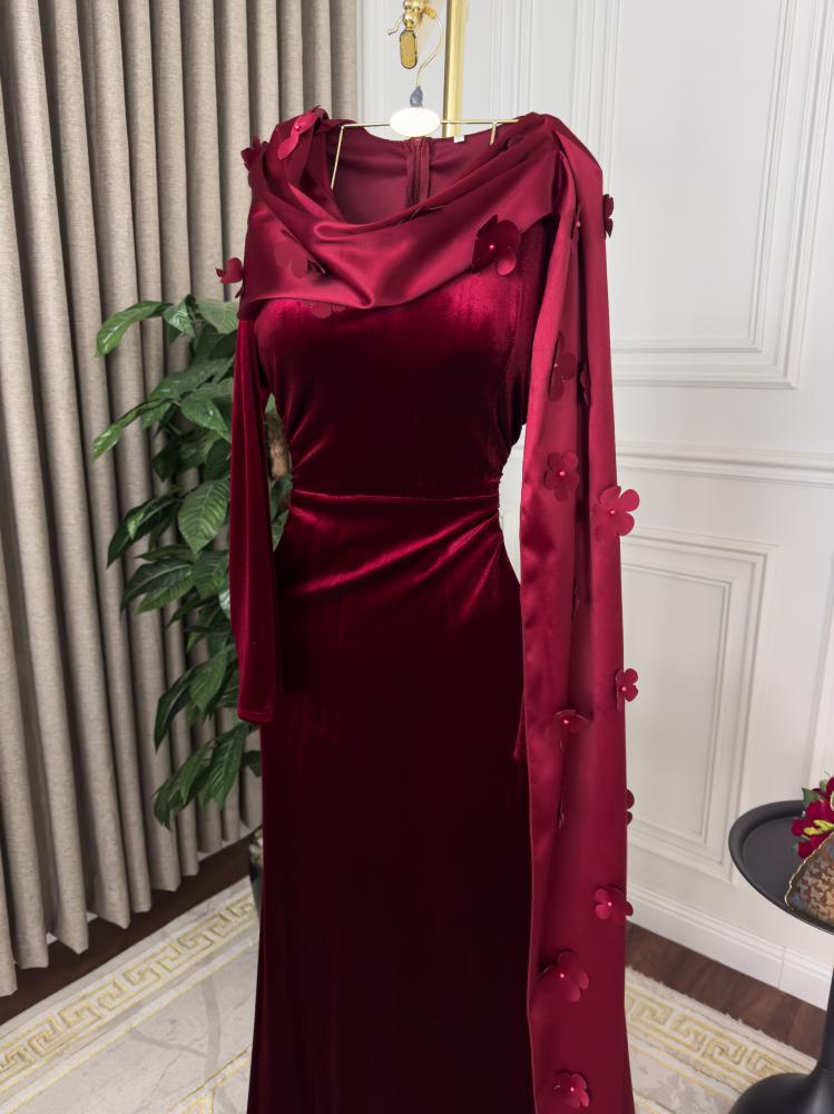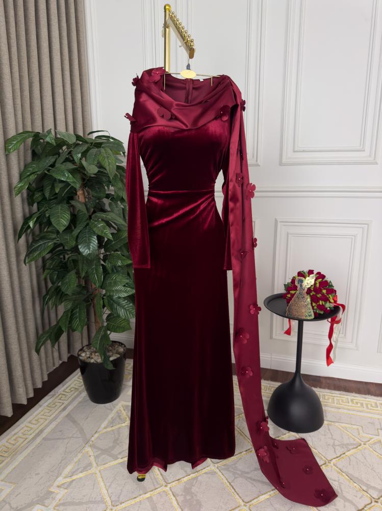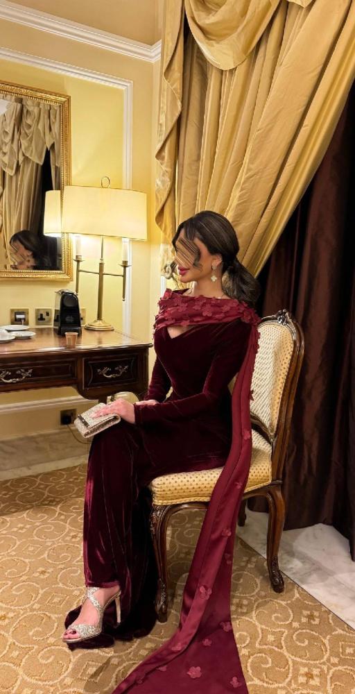 هذا الفستان الفخم هو تجسيد للأناقة والرقي، مصنوع من المخمل الكوري الناعم الذي يعكس الفخامة في كل تفصيل. يتميز بقصة ضيقة تُبرز جمال القوام مع ذيل طويل يضفي لمسة ملكية على الإطلالة. الياقة العالية مُزينة بوشاح أنيق مُطرز بزخارف زهرية تضيف لمسة رومانسية. التصميم الكلاسيكي الممزوج بالتفاصيل العصرية يجعله مثالياً للمناسبات الفاخرة والسهرات.