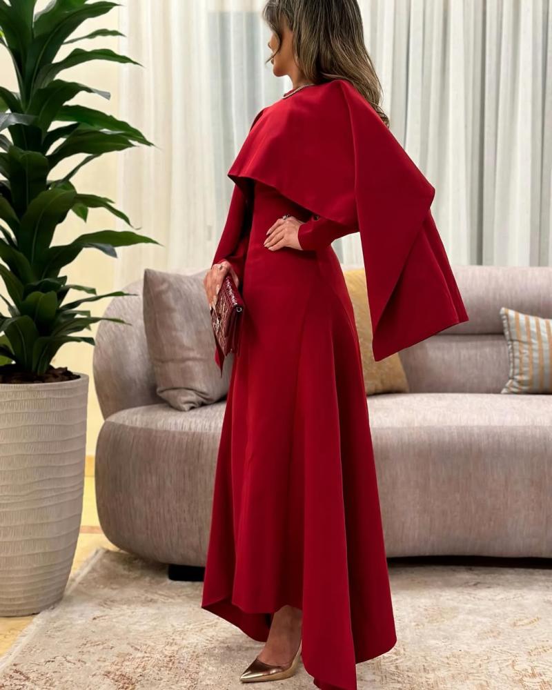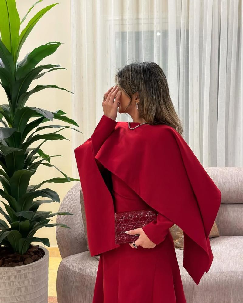 تميزي بإطلالة أنيقة وفاخرة مع هذا الفستان الأحمر الساحر، المصنوع من قماش التفته الفاخر بلمعته الراقية. يتميز بتصميم أنثوي راقٍ بقصة طويلة منسدلة تزيد من فخامة الإطلالة، مع تفصيلة الكاب الأنيقة التي تضيف لمسة درامية جذابة. الأكمام الطويلة الواسعة تعزز من رونق التصميم، مما يجعله الخيار المثالي للمناسبات الفاخرة والاحتفالات الخاصة مثل العيد.