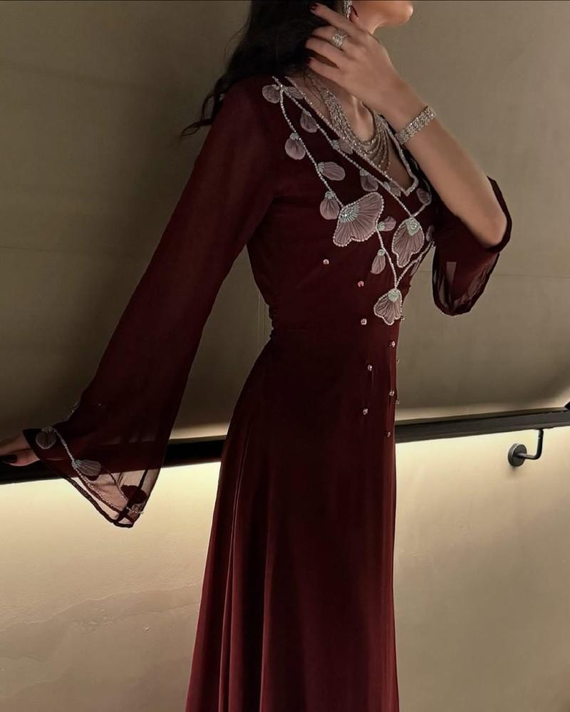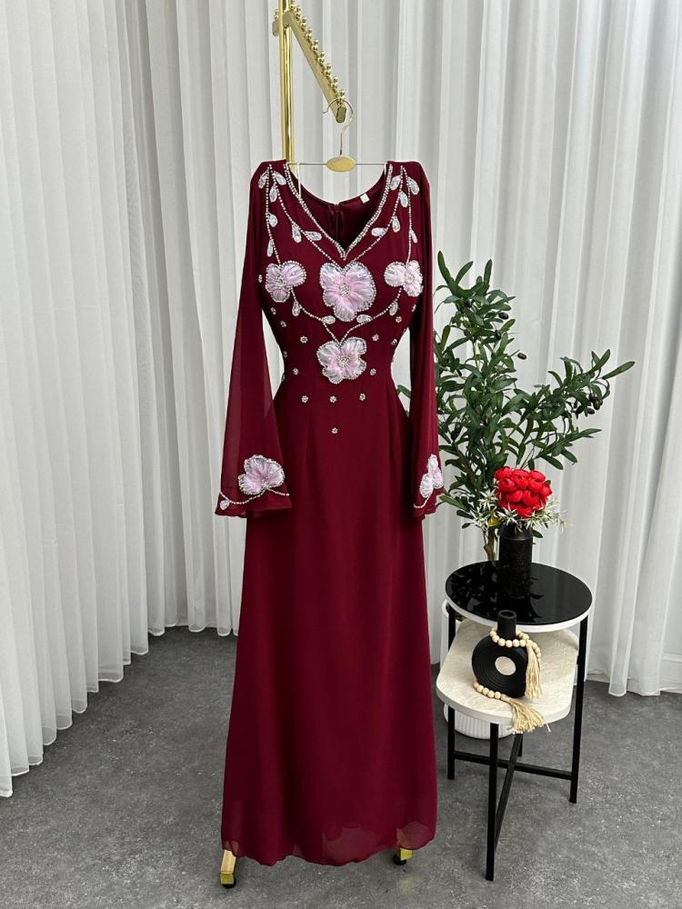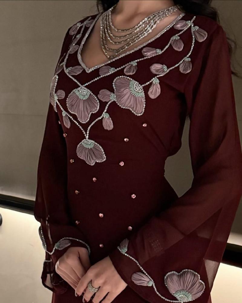 - اللون: عنابي مع تطريز زهري وأحجار براقة