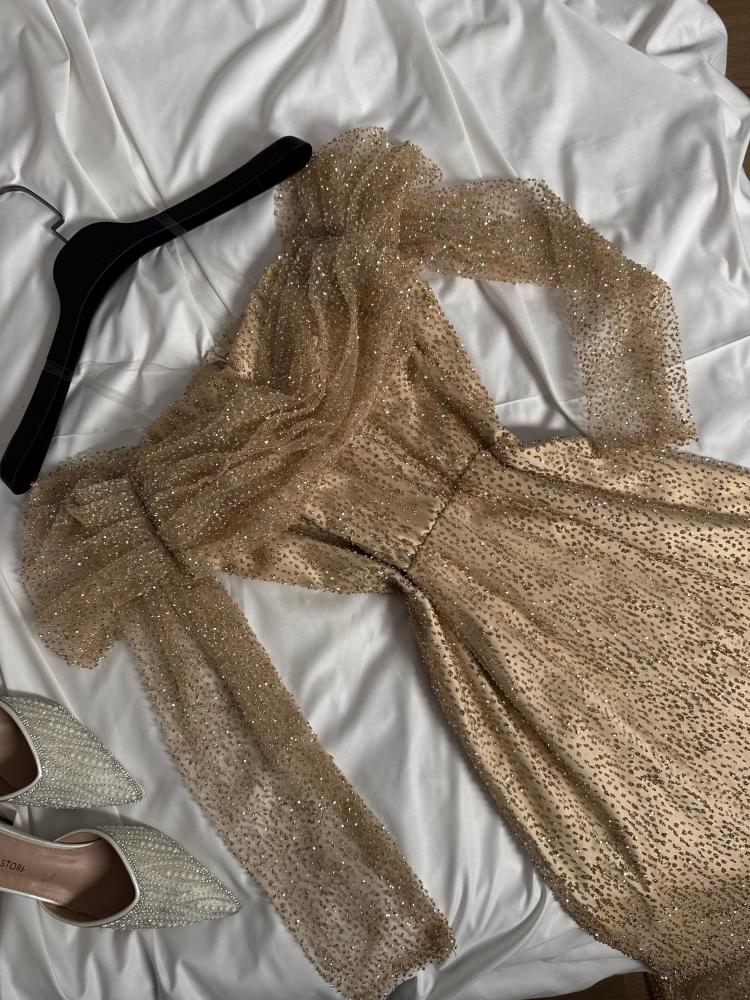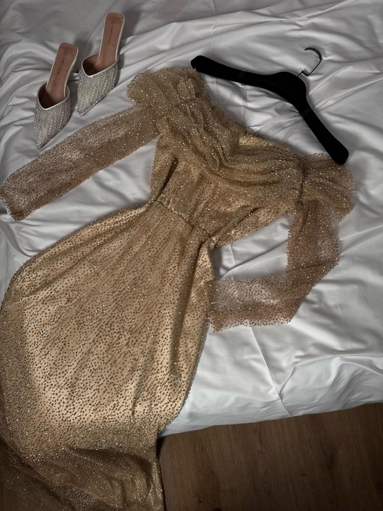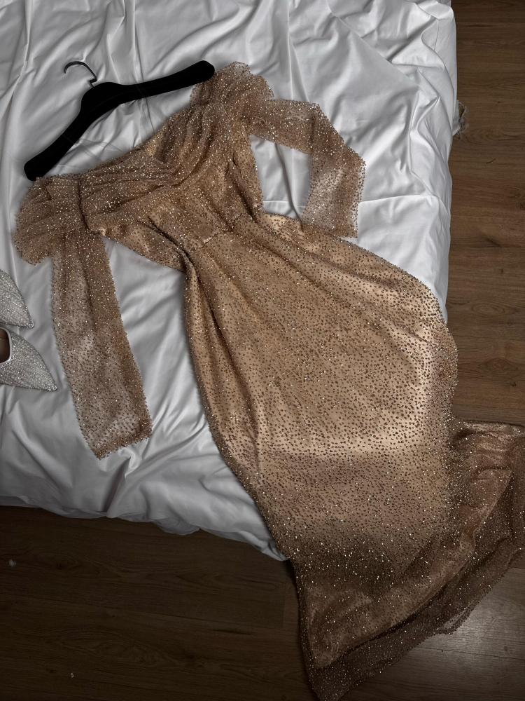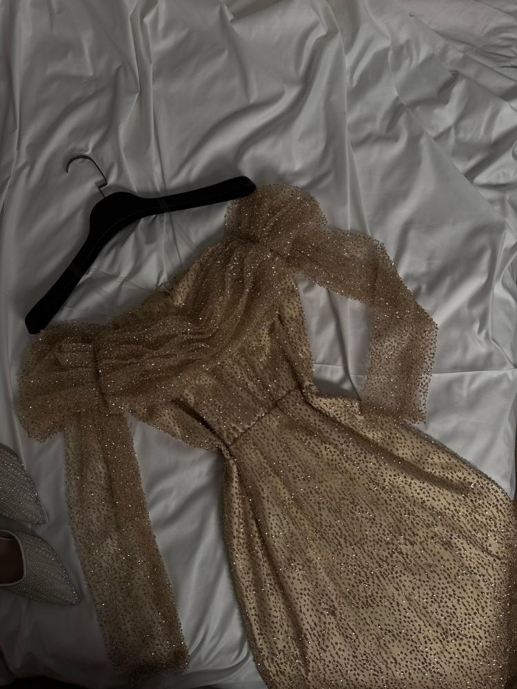 ✨ فستان سهرة فاخر بترتر لامع بلون ذهبي أنيق ✨