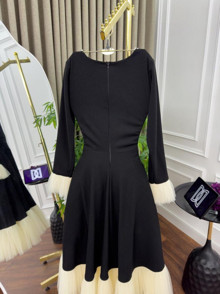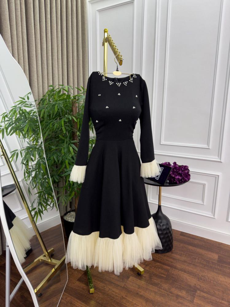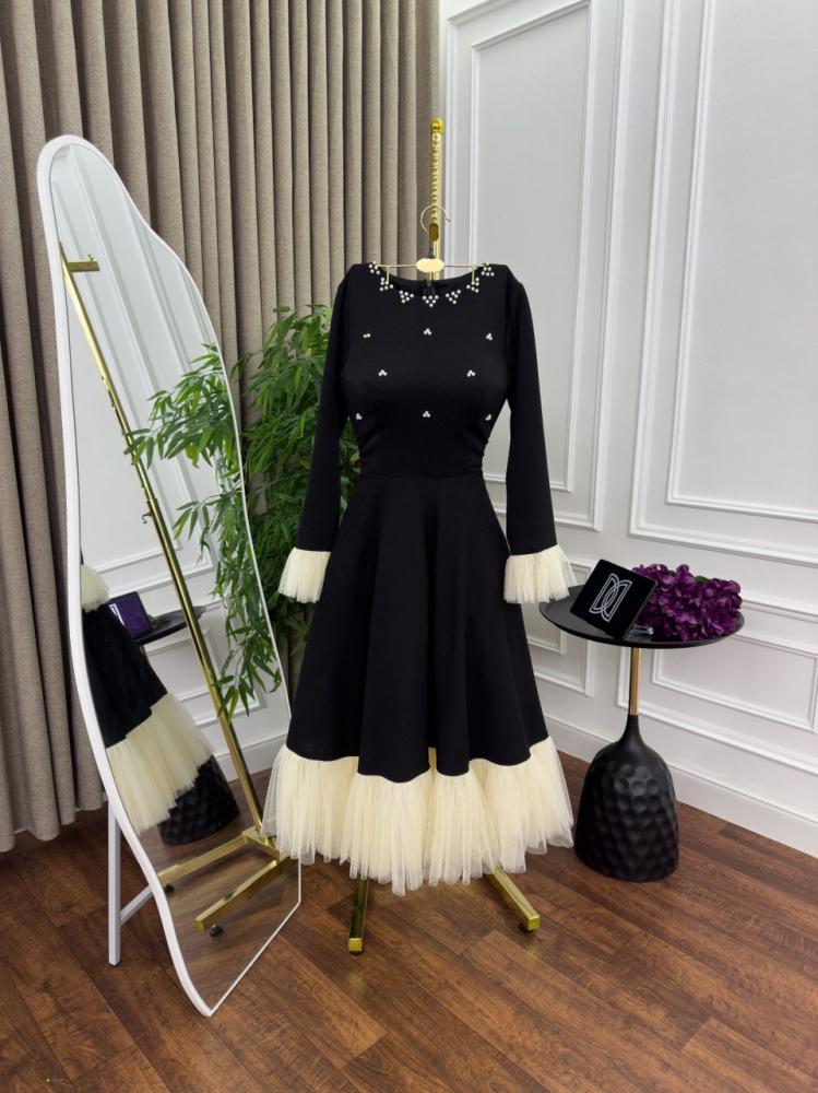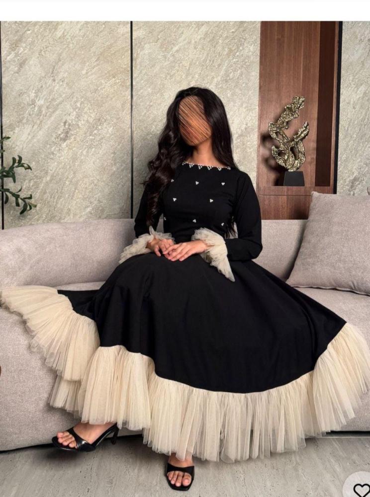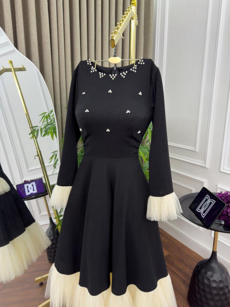 يأتي الفستان بلون أسود ساحر يضفي لمسة من الفخامة، مع تفاصيل راقية من اللؤلؤ المتناثر على الصدر، ليمنحك إطلالة فاخرة. كما يتميز بأكمام طويلة مزينة بكشكش ناعم عند المعصم، مما يضفي عليه لمسة من الرقي. أما التنورة، فهي مزينة بحواف من التول بلون بيج أنيق، ما يضفي لمسة ناعمة ومميزة على التصميم.