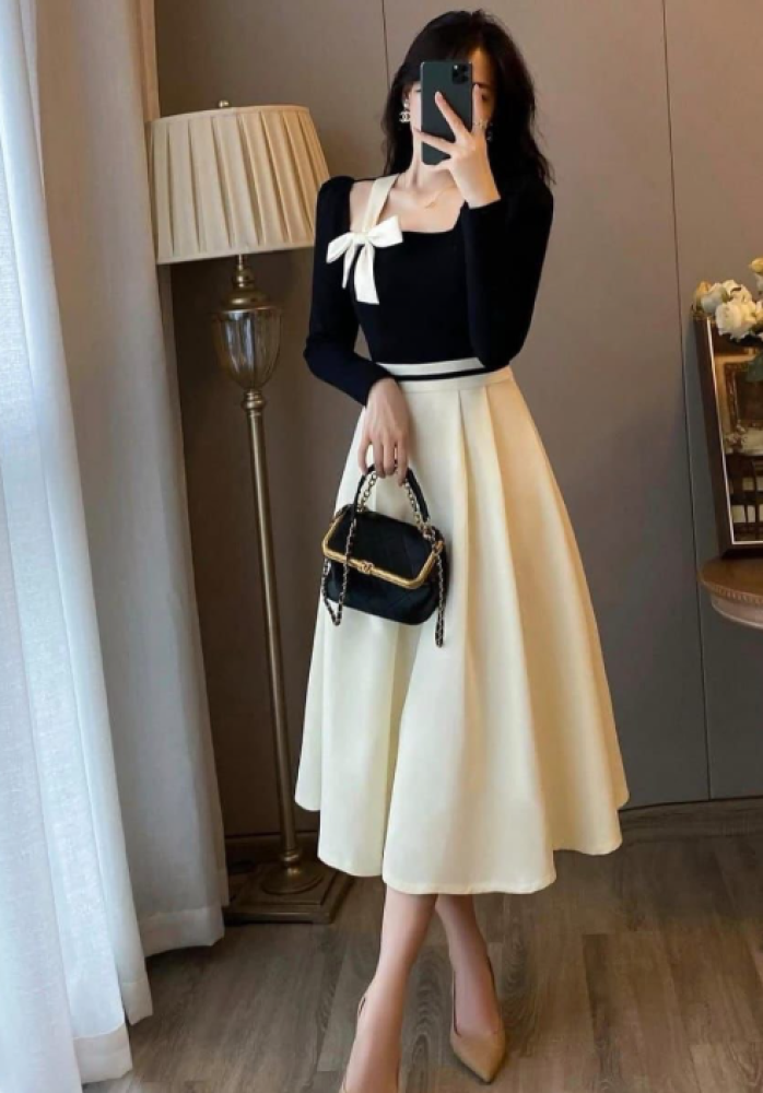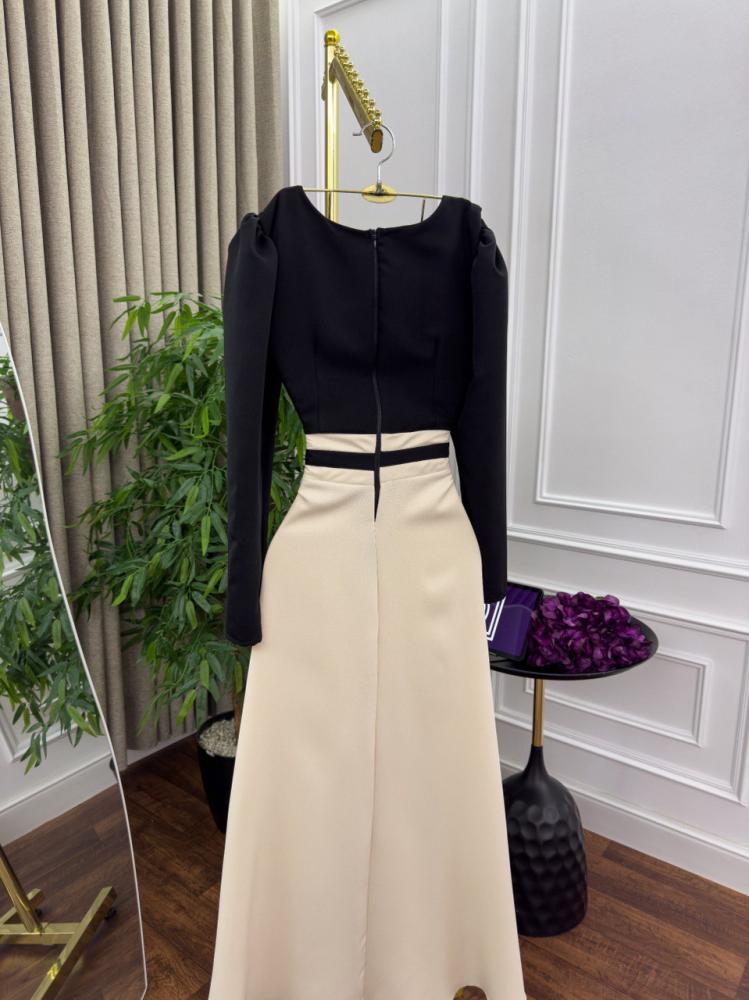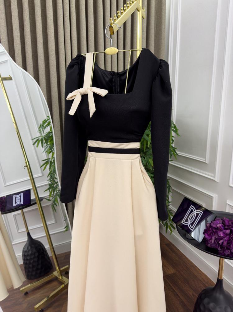 فستان أنيق بتصميم راقٍ يجمع بين الكلاسيكية والعصرية، مثالي لإطلالة مميزة في العيد. يتميز بتوب أسود بأكمام طويلة مزين بفيونكة أنيقة على الكتف، مع تنورة واسعة بلون أوف وايت تضيف لمسة من النعومة والأنوثة. مصنوع من قماش الباربي الفاخر الذي يجمع بين النعومة والانسيابية لمنحك راحة وأناقة طوال اليوم. خيار مثالي للمناسبات والاحتفالات بأسلوب فريد وجذاب. ✨التصميم: فستان أنيق مكون من قطعتين متصلتين بتنسيق أنيق بين الأسود والأوف وايت.