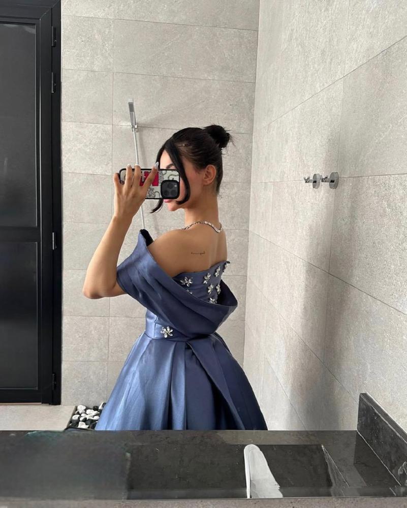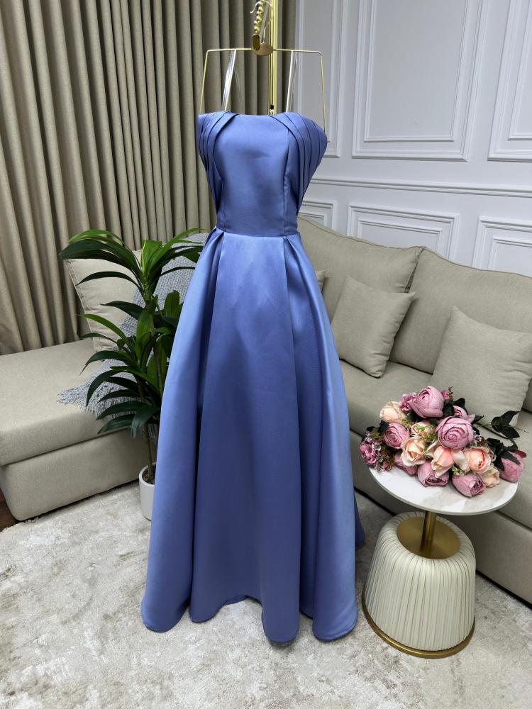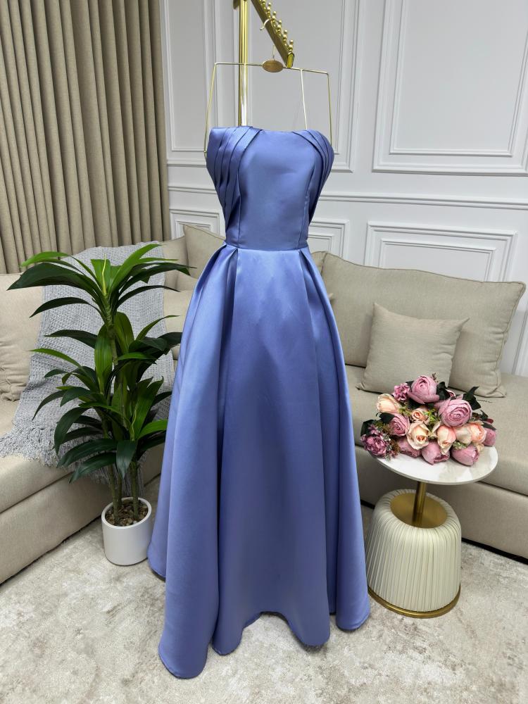 مصنوع من قماش لامع بدرجة أزرق مائل للبنفسجي يضيف لمسة من الرقي، مع تنورة منفوشة تمنح حضوراً فاخراً في كل مناسبة.
