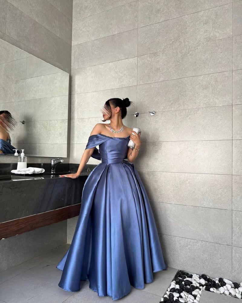 فستان سهرة ملكي بقصة أوف شولدر (كتوف مكشوفة) بتصميم فخم وأنيق، يضفي على إطلالتك سحر خاص لا يُقاوم.