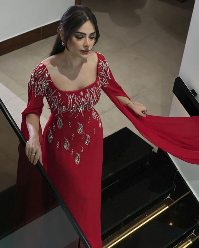 5-الوصف/ فستان سهرة أحمر يأسر الأبصار، مطرز بأناقة بترتر وكريستال وينسدل إلى الأسفل. يجسد هذا الفستان روعة الأناقة والفخامة، مضيفًا لمسة فاتنة إلى إطلالتك في السهرات الخاصة.