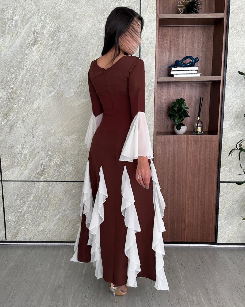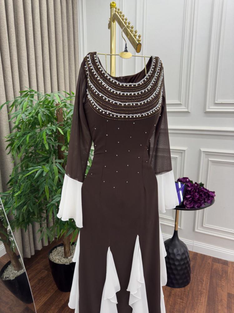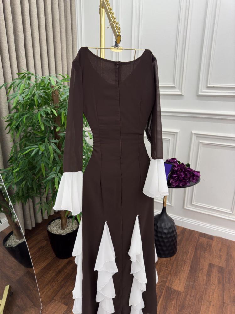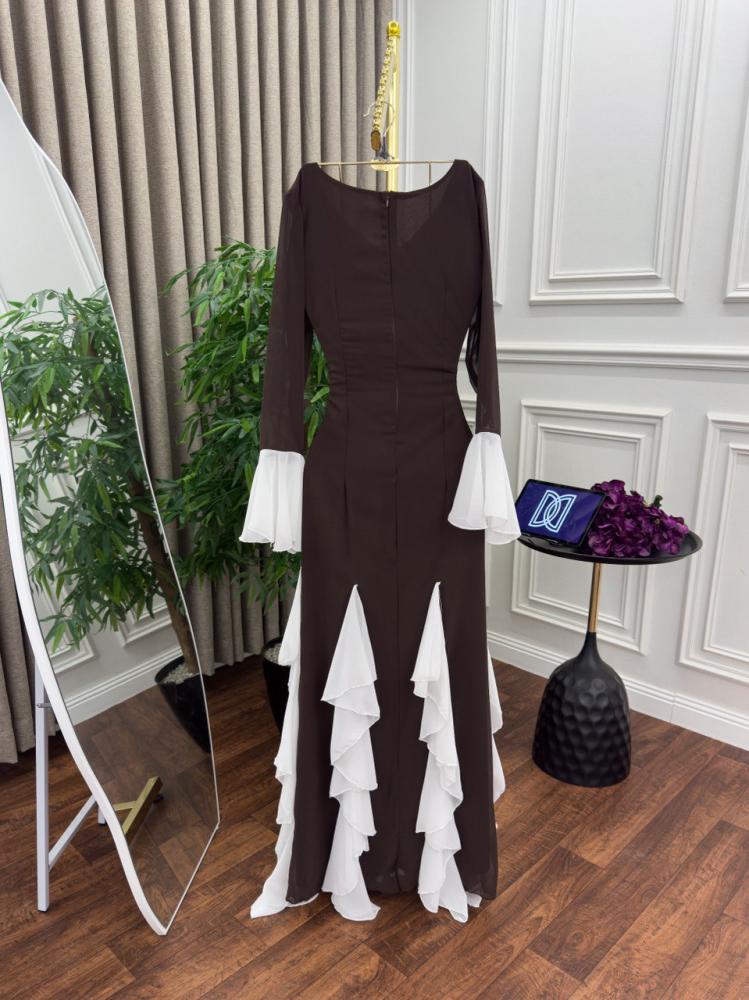 وصف الفستان: فستان سهرة أنيق ومميز مصنوع من خامة كريب استرتش الفاخرة مع تفاصيل من الشيفون الناعم لإضفاء لمسة من الرقي والفخامة. يأتي الفستان بلون بني دافئ مع لمسات من القصات البيضاء التي تضيف له تباينًا رائعًا، مما يجعله خيارًا مثاليًا للعيد والمناسبات الخاصة. تصميمه الفريد يعكس الأناقة والتفرد، ويجمع بين الراحة والجمال.