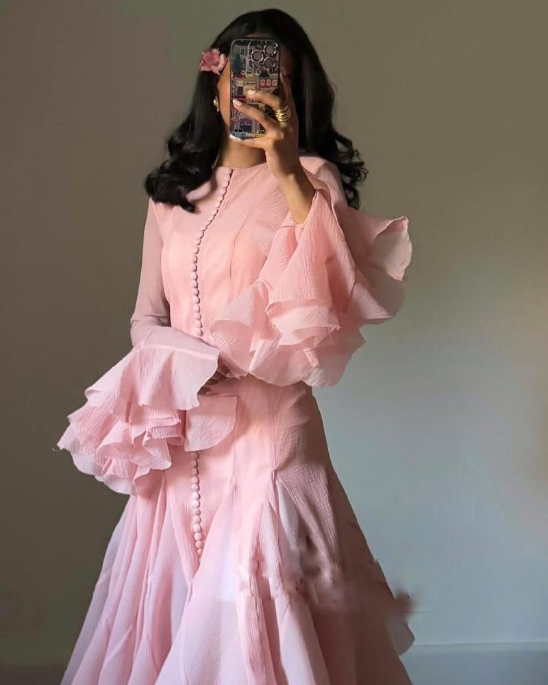 - التصميم: كشكش أنيق على الأكمام والتنانير لإطلالة فاخرة.