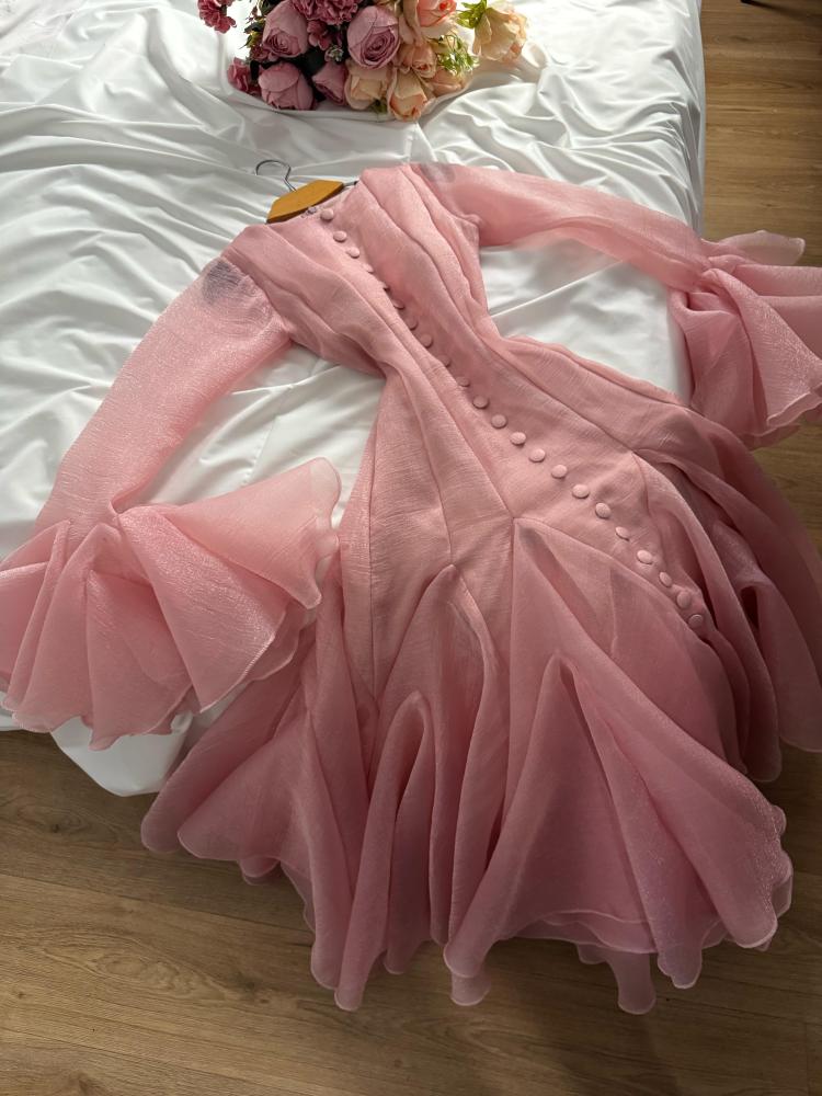 يأتي الفستان بتصميم طويل مع أكمام طويلة وواسعة تنتهي بكشكش أنيق يزيد من فخامته. يتميز بلمسات درابية أنثوية على الأكمام والتنانير، مع أزرار أمامية تضيف له لمسة كلاسيكية راقية. قصة الخصر المحددة تبرز أنوثة الجسم، بينما تنسدل التنورة بانسيابية راقية لمظهر أنثوي ساحر.