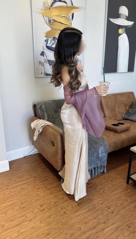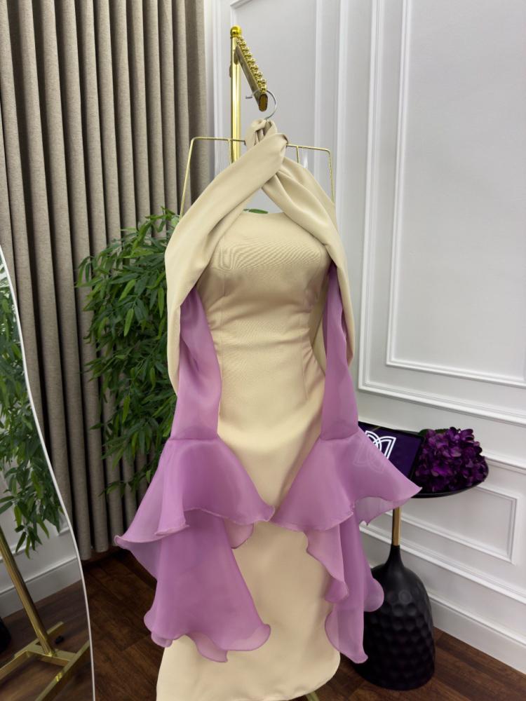 فستان طويل وأنيق بلون فاتح. يتميز الفستان بأكمام شفافة بلون أرجواني فاتح، مما يضفي لمسة من الرقي والأناقة. الفستان ضيق عند الخصر وينسدل بشكل مستقيم إلى الأسفل، مما يبرز القوام بشكل جميل. المواصفات :