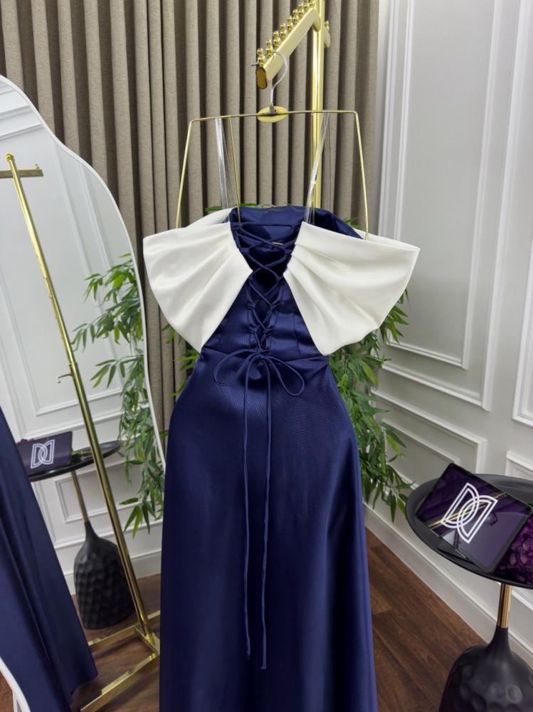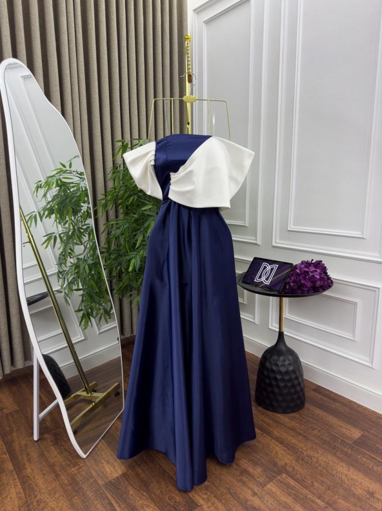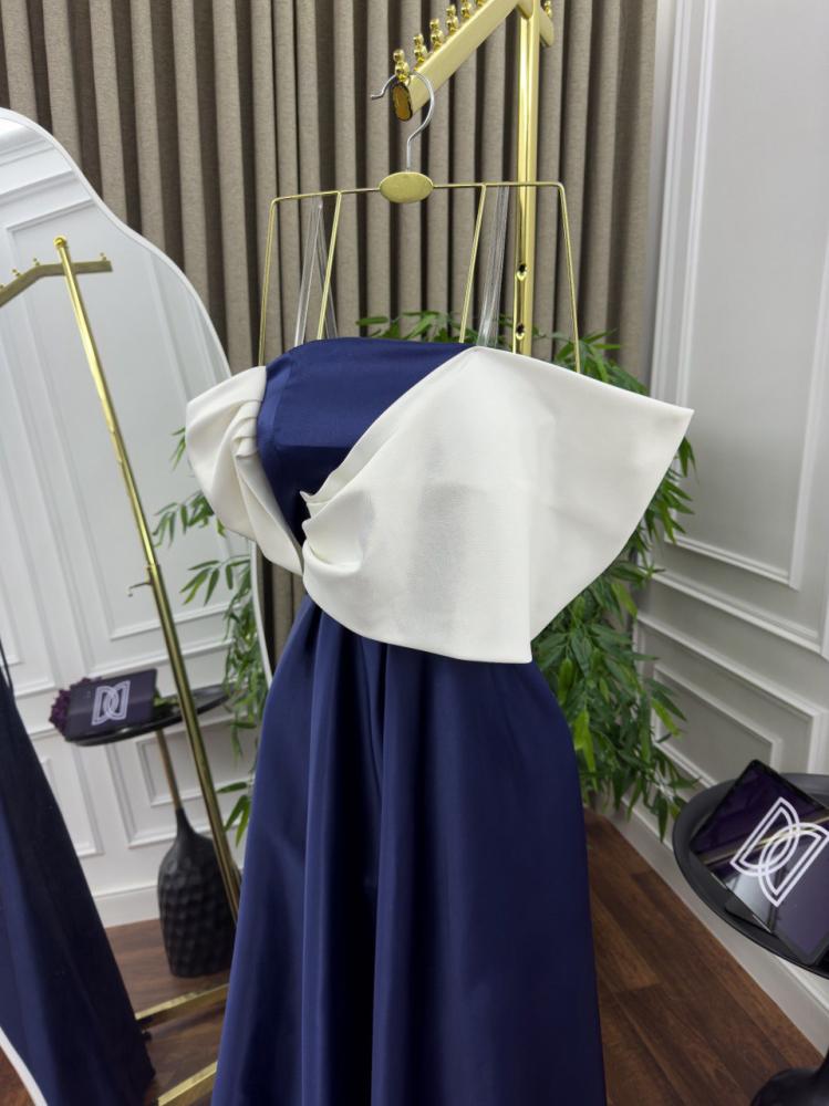 يأتي الفستان بتصميم أوف شولدر جذاب، حيث تتميز الصدرية بلونين متناغمين بين الكحلي والأوف وايت بتداخل أنيق يمنح الفستان لمسة عصرية ومميزة. أما التنورة، فهي واسعة بانسيابية راقية تضفي طابعًا أنثويًا ساحرًا على إطلالتك.