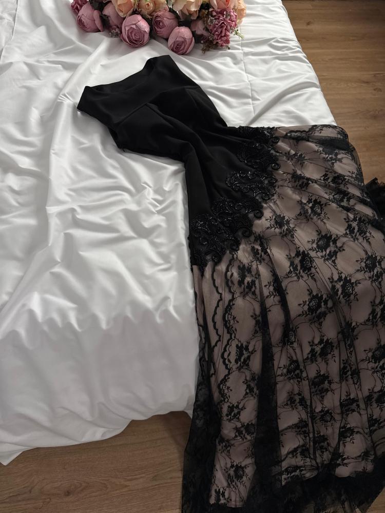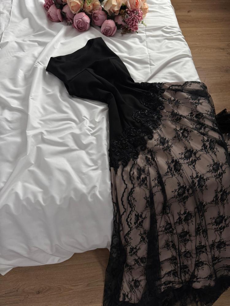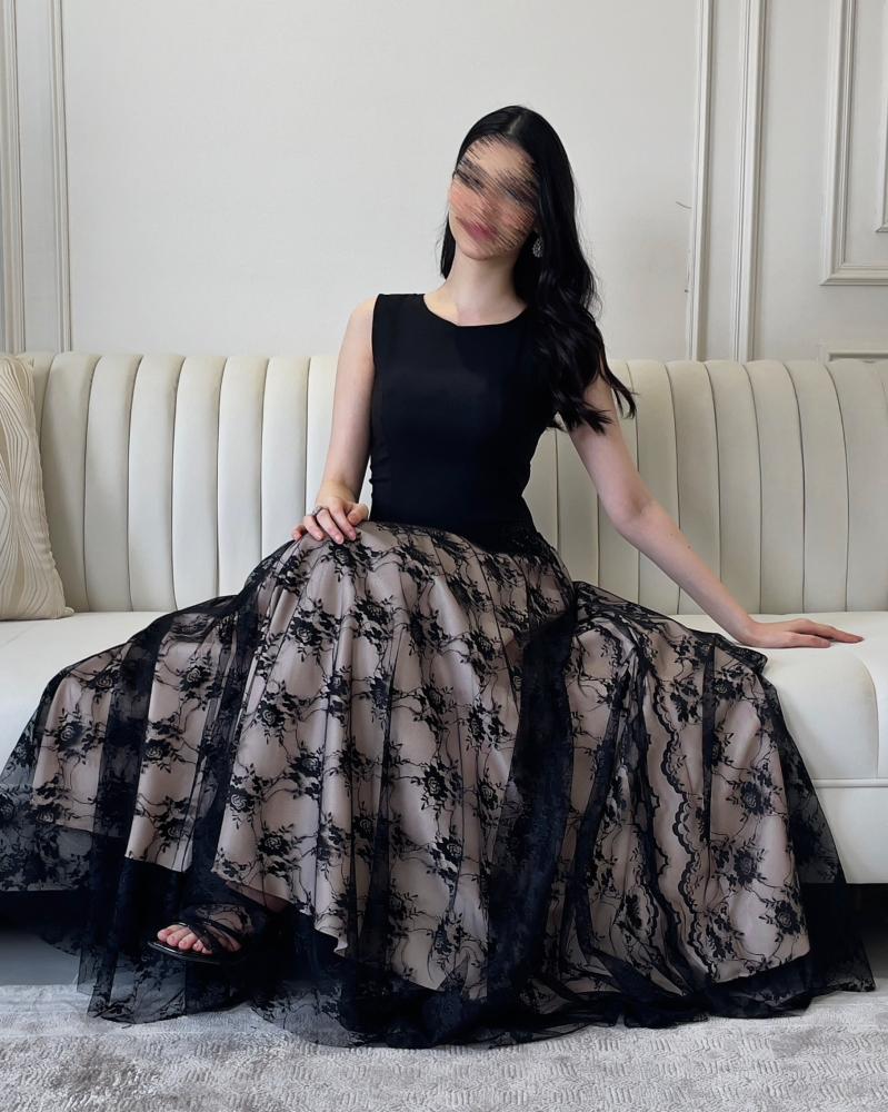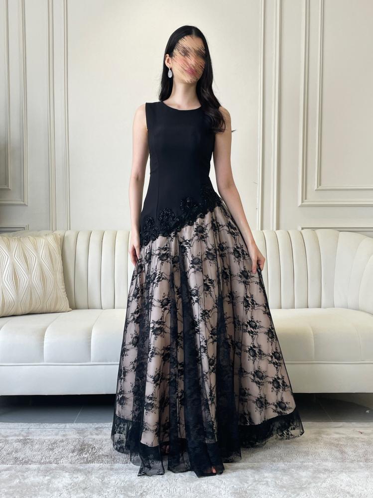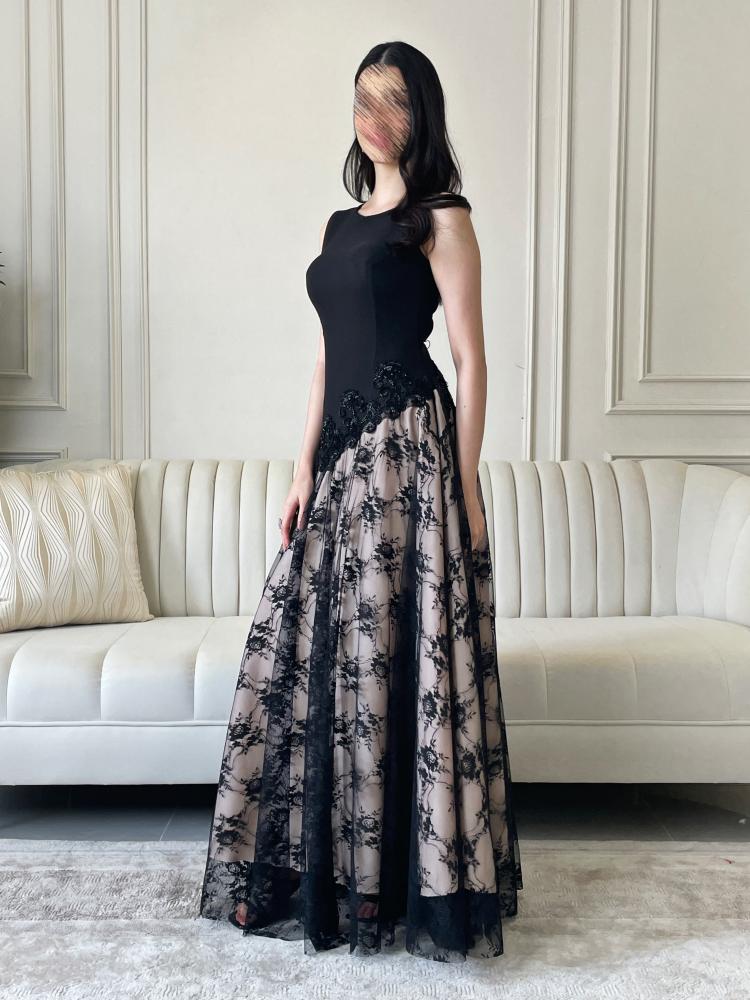 • الفستان أنيق وفخم، يتميز بتصميم أنثوي راقٍ. الجزء العلوي من الفستان باللون الأسود السادة، بدون أكمام وبقصة ضيقة تُبرز القوام. أما الجزء السفلي، فهو مصنوع من قماش الدانتيل الأسود المطرز فوق طبقة داخلية بلون بيج، مما يخلق تباينًا جذابًا بين الطبقتين. تنسدل التنورة بقصة A-Line متوسطة الطول، مما يضفي لمسة راقية تناسب المناسبات الفاخرة. الفستان مثالي للحفلات والسهرات ويعكس مزيجًا من الأناقة والكلاسيكية العصرية. الخامة: مصنوع من الدانتيل المطرز فوق طبقة من التفته الناعمة.