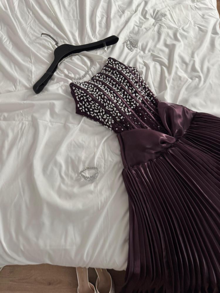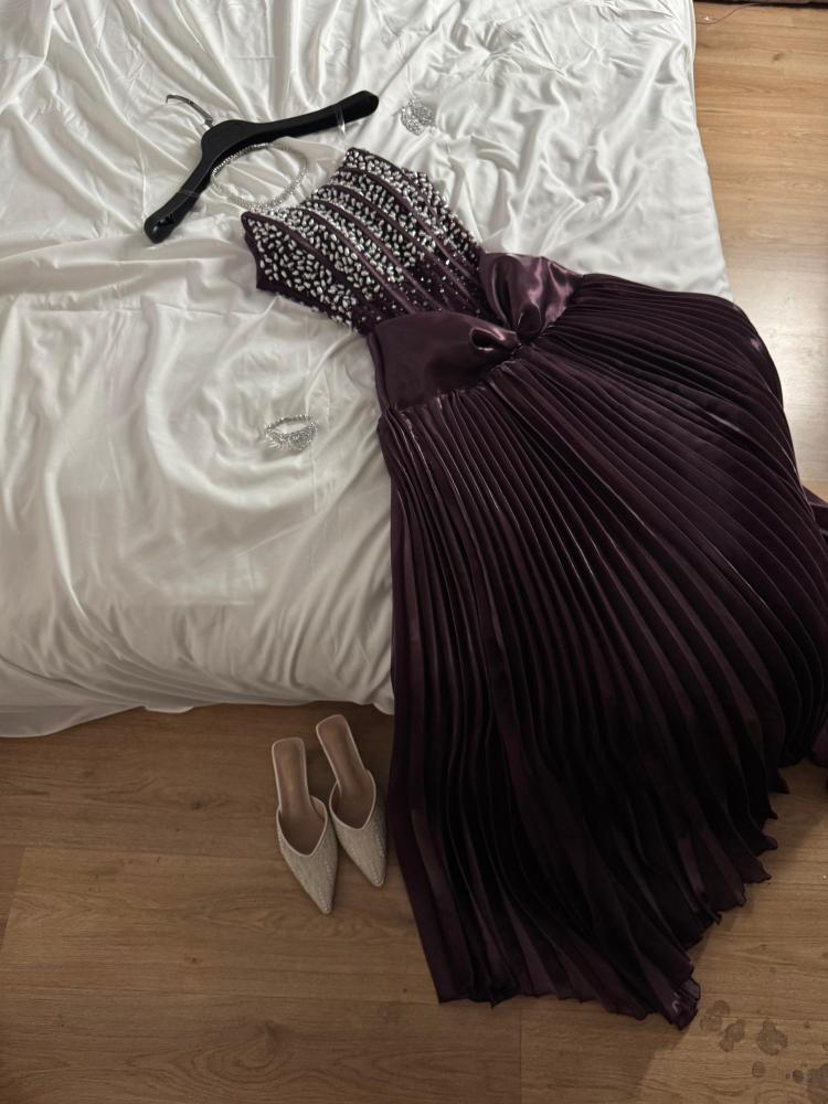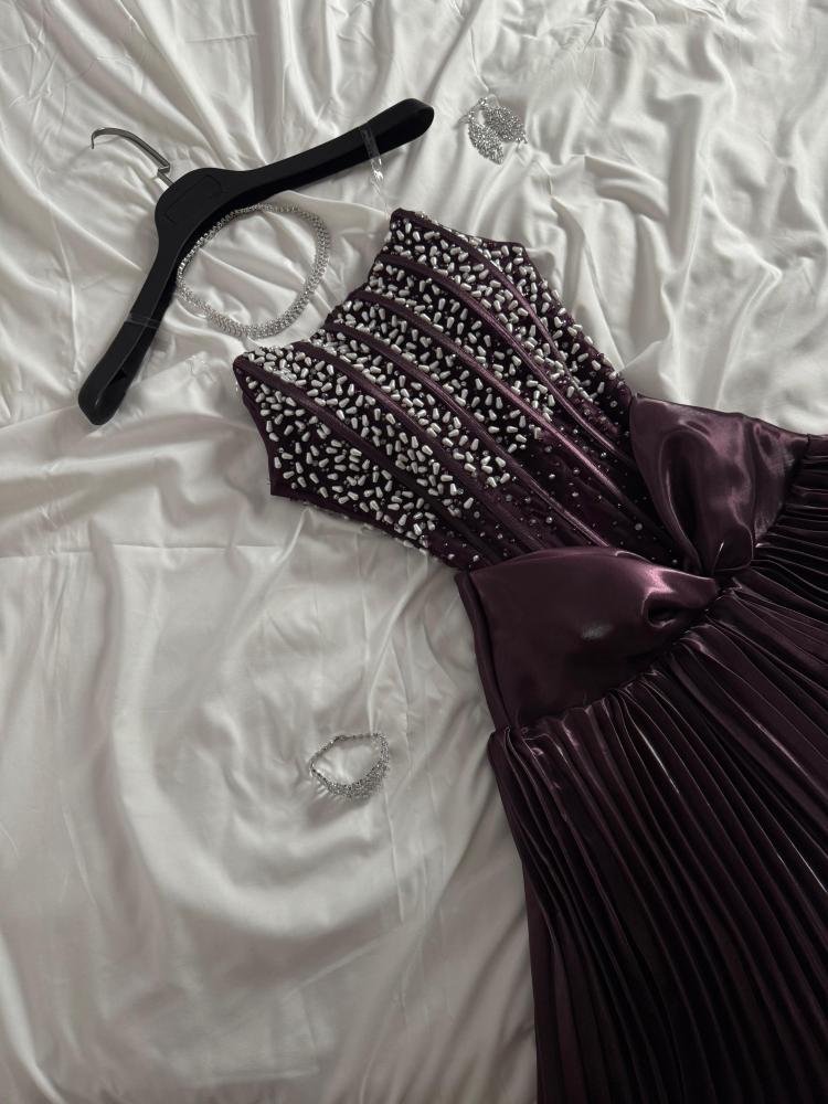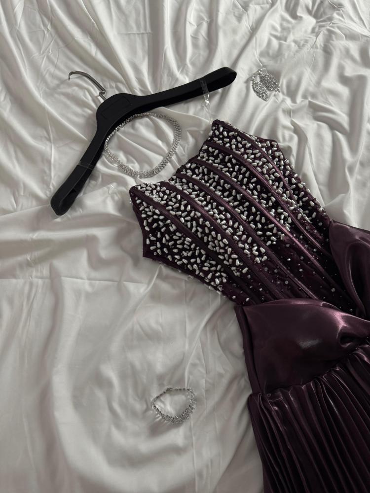 - وصف الفستان:تألقي بإطلالة فاخرة مع هذا الفستان البنفسجي الساحر المصمم من قماش التفته اللامع، والذي يجمع بين الأناقة والجاذبية. يتميز الكورسيه بتطريز فاخر ولمسات برّاقة تعزز من جمال التصميم وتمنحك حضورًا لا يُنسى في كل مناسبة. خصائص الفستان:الخامة: تفته لامع راقي
