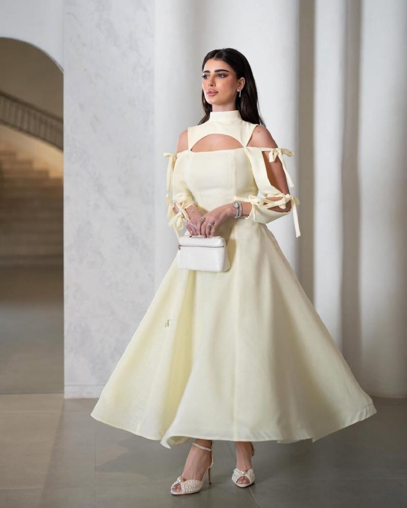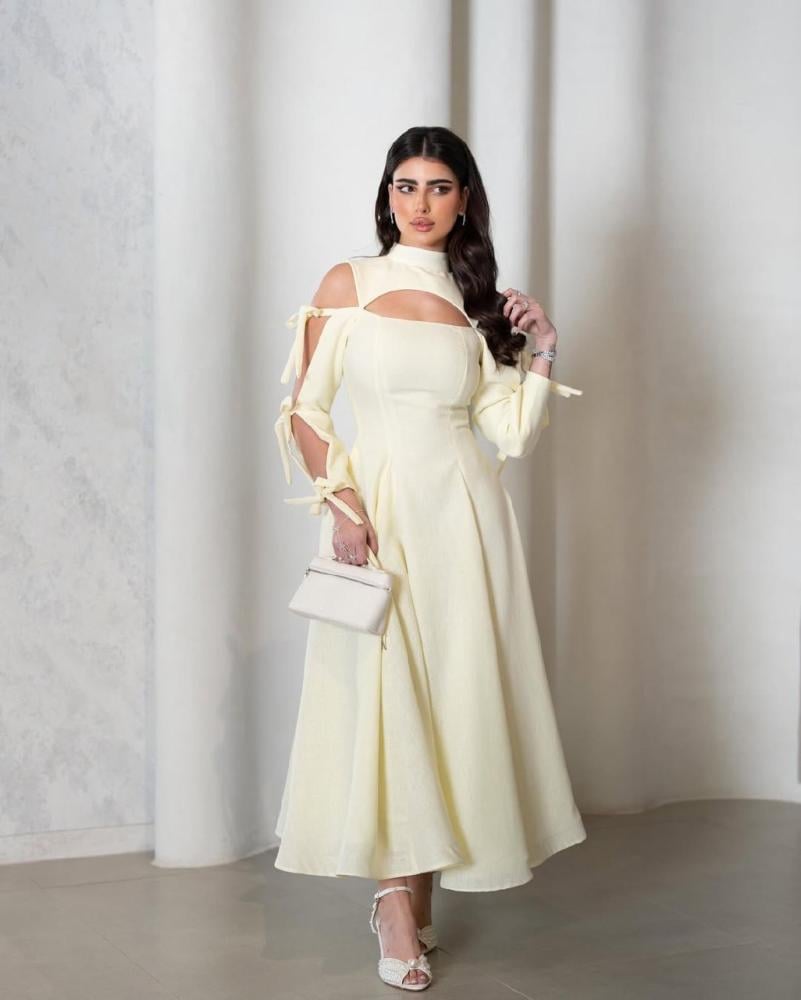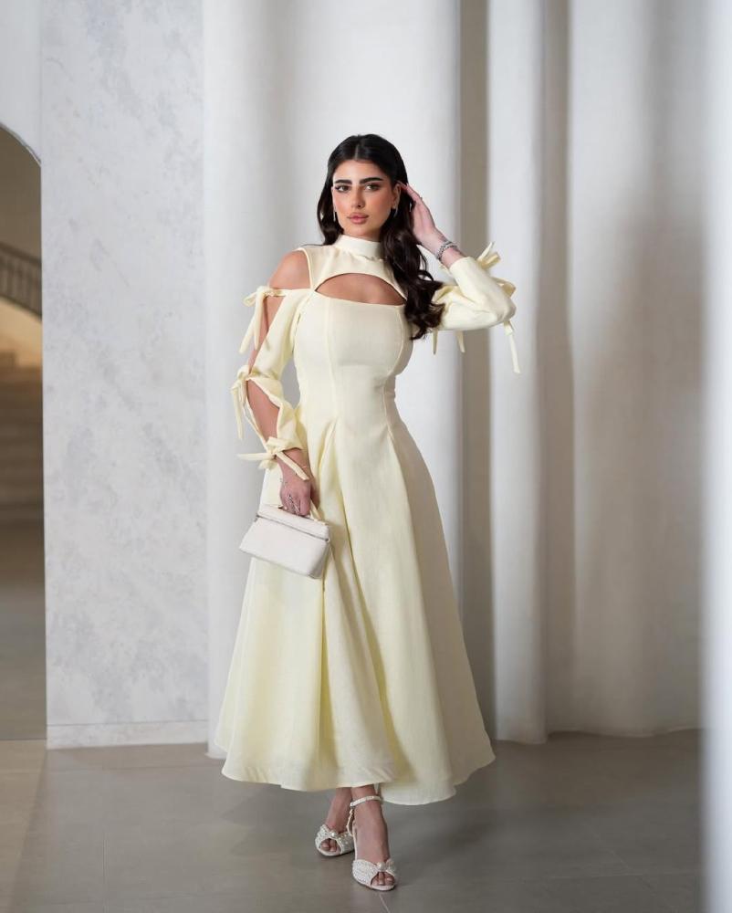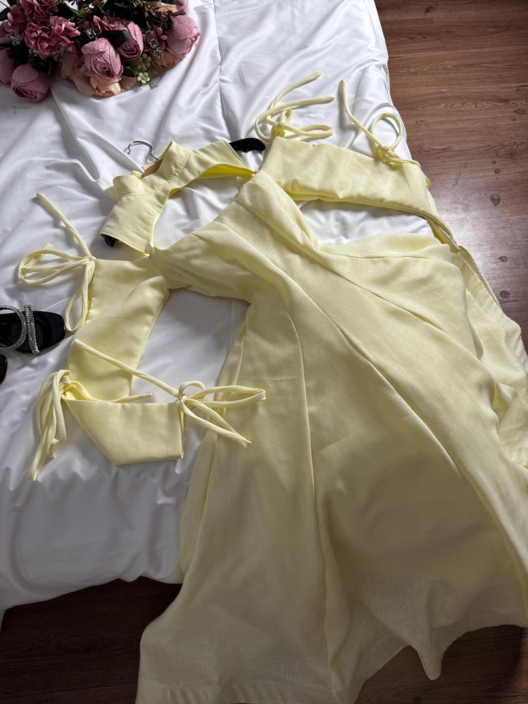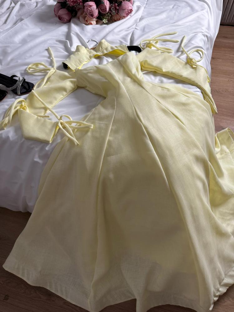 تألقي بإطلالة راقية في العيد مع هذا الفستان الساحر بلونه الليموني الناعم وتصميمه الفريد. يتميز بقصة أنيقة بقماش اللينين الخفيف والمريح، مع تفاصيل عصرية مثل الأكمام المكشوفة والمربوطة بأشرطة رقيقة لإضافة لمسة أنثوية ناعمة. التصميم مزود بفتحة أنيقة في منطقة الصدر، وياقة مرتفعة لمظهر عصري فاخر. التنورة الواسعة تمنحك حرية الحركة وإحساسًا بالراحة، مما يجعله خيارًا مثاليًا للمناسبات الخاصة.