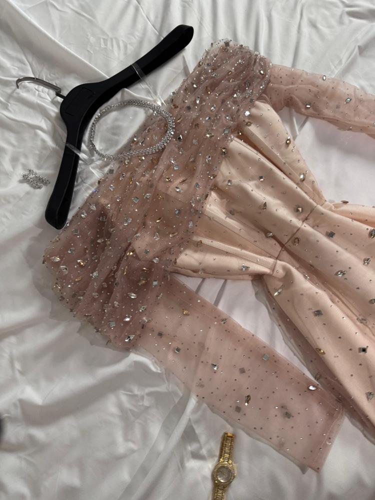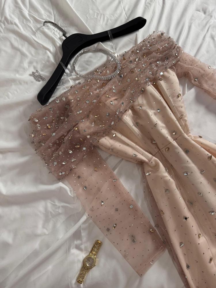 - الأكمام: طويلة من التل الشفاف مع خرز لامع