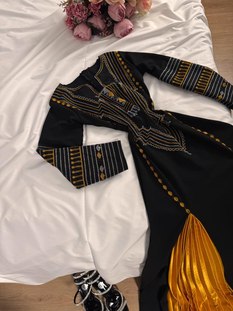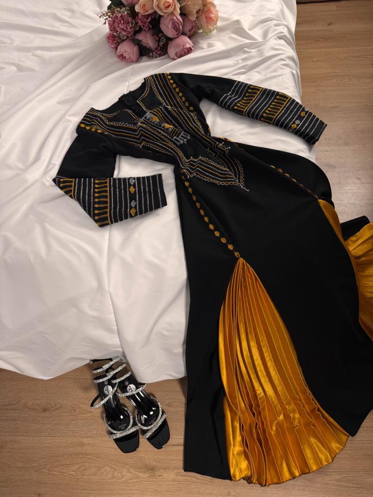 - اللون: أسود فاخر مع تفاصيل ذهبية ولمسات بليسيه باللون الأصفر.