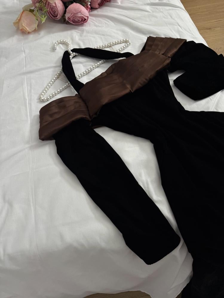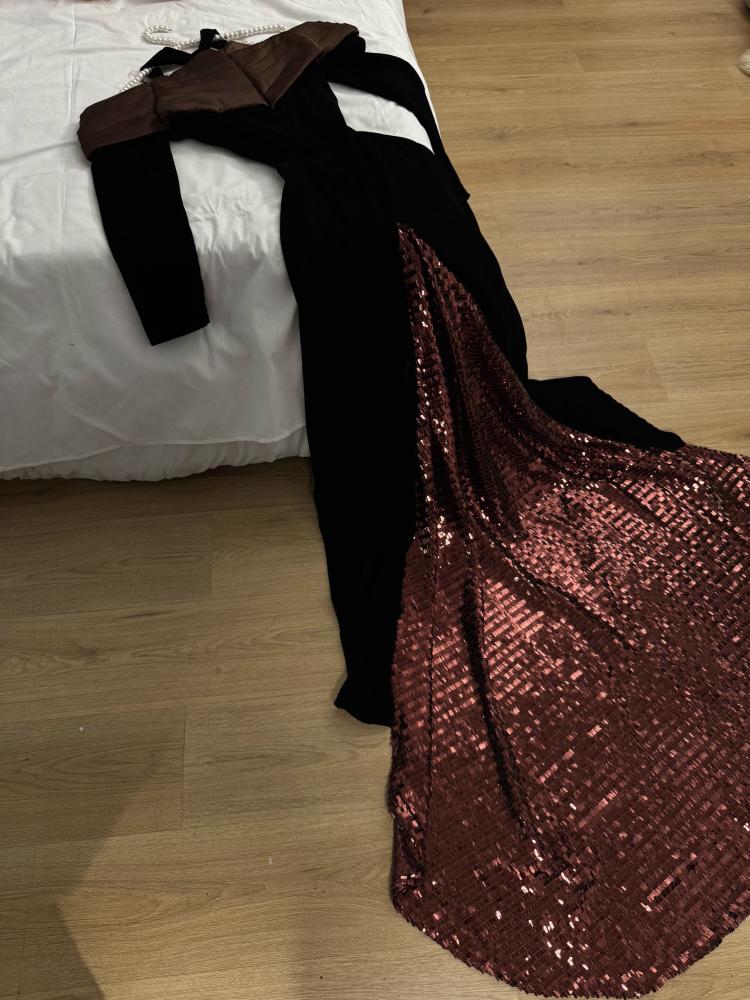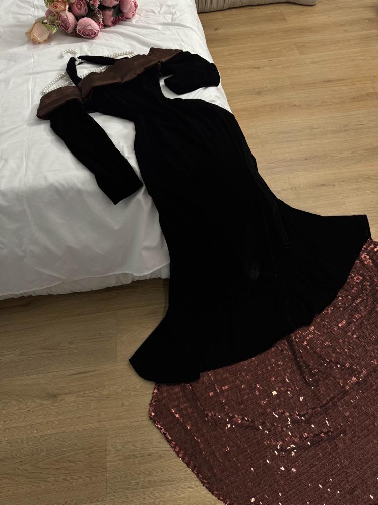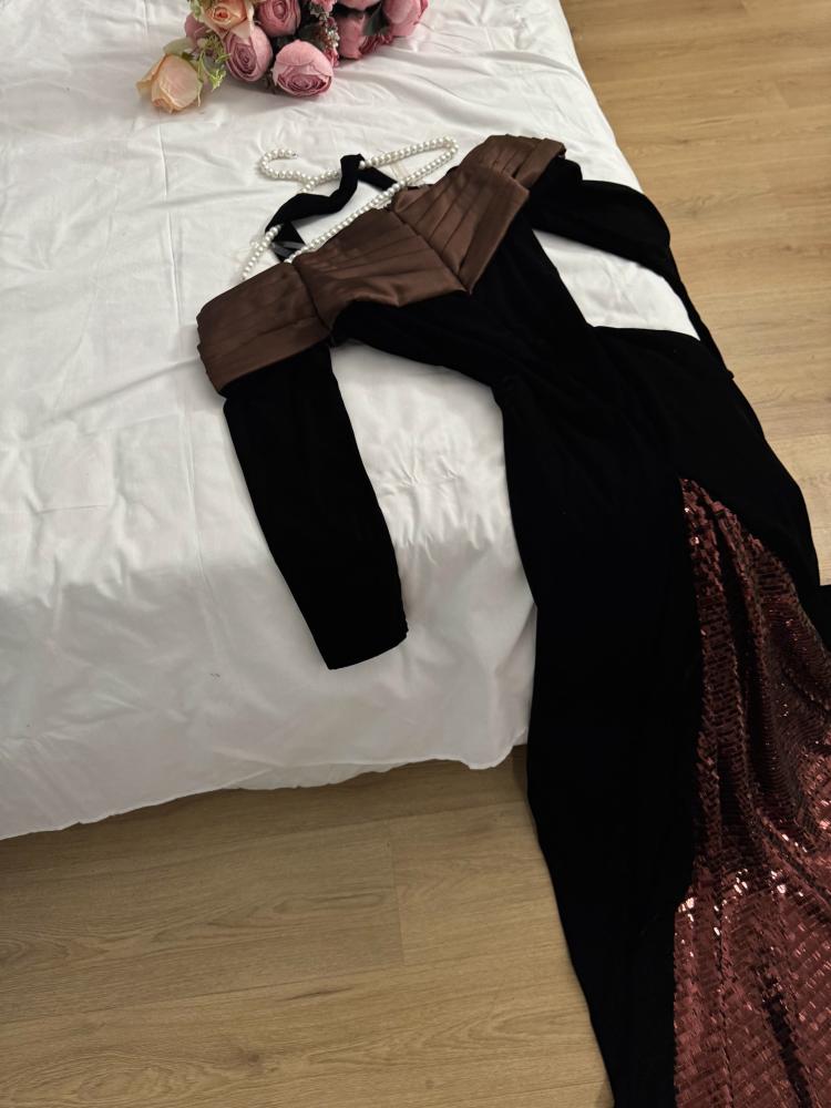فستان استثنائي يجمع بين الفخامة والجاذبية، مصنوع من المخمل الأمريكي الفاخر الذي يتميز بنعومته ولمعانه الراقي. تصميمه يبرز القوام بشكل أنيق، مع ذيل طويل مصنوع من الترتر اللامع الذي يضفي لمسة ساحرة من البريق والحيوية مع كل خطوة.