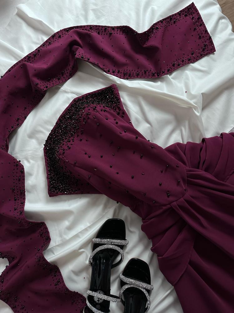 • التفاصيل العلوية: صدر مطرز بالكامل بالخرز اللامع باللون الأسود، مع ياقة دائرية أنيقة تلتف حول الرقبة