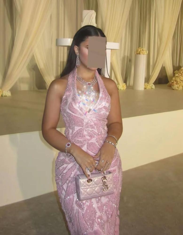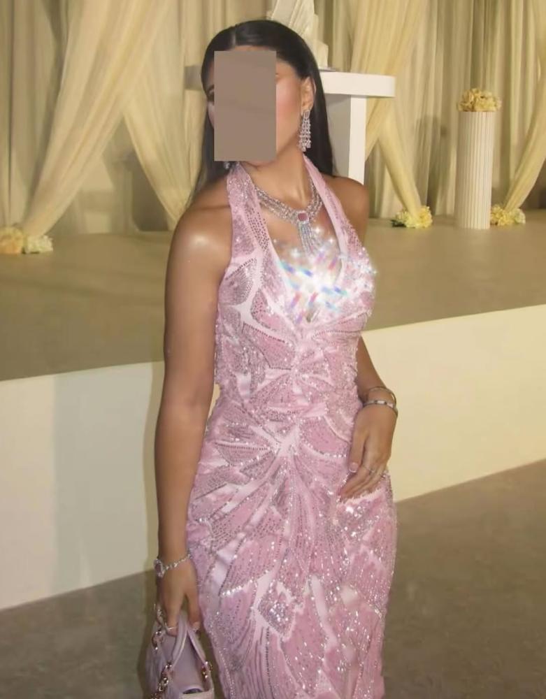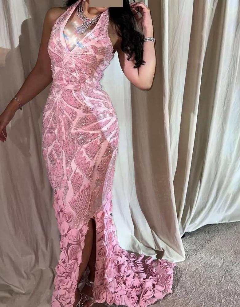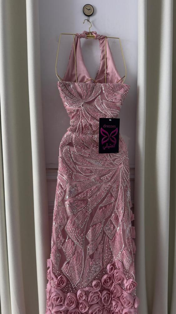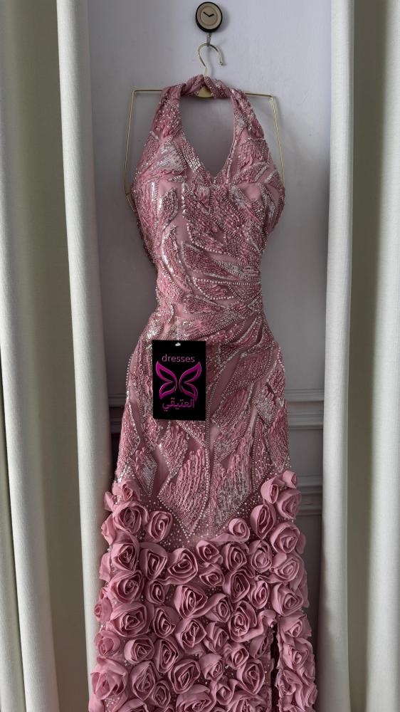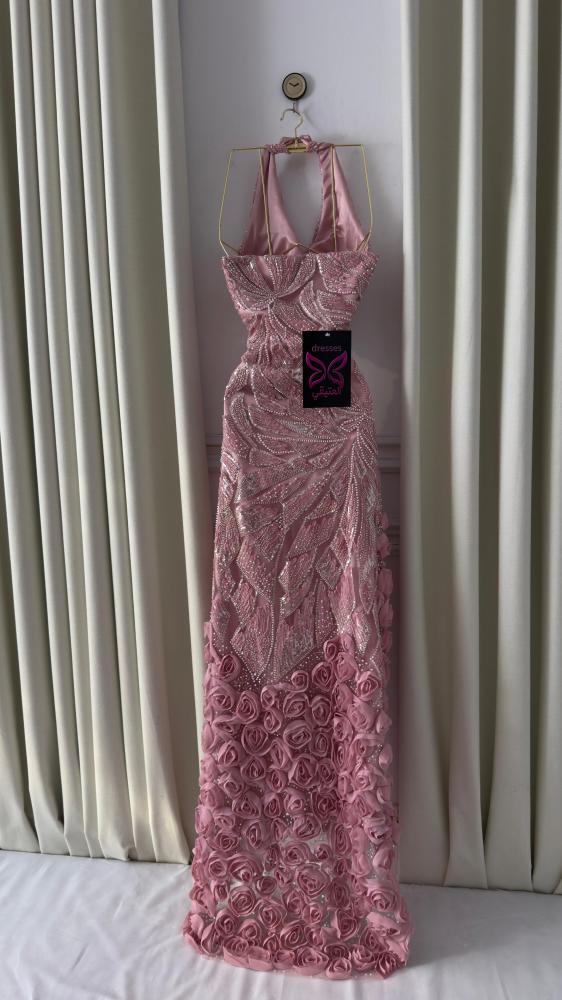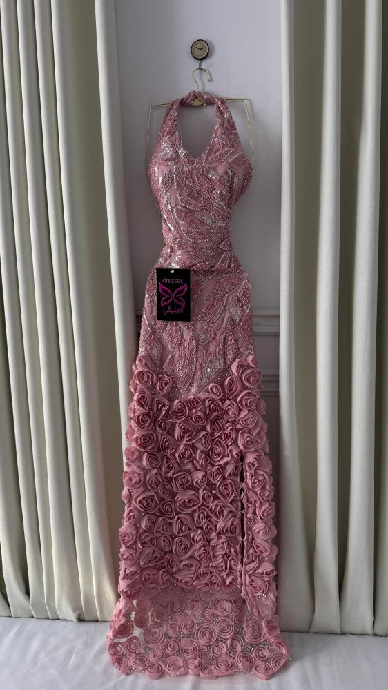 فستان سهرة وردي فاخر بتصميم استثنائي يجمع بين الفخامة والأنوثة. يتميز بتطريز لامع يدوي يزين كامل الفستان ليمنحك إطلالة متألقة، مع قصة ضيقة تُبرز جمال القوام. يزداد الفستان روعة بتفاصيل الورود البارزة في أسفل التنورة والشق الأمامي الأنيق الذي يضفي لمسة عصرية جذابة. مثالي للمناسبات الفاخرة، السهرات، وحفلات الزفاف.