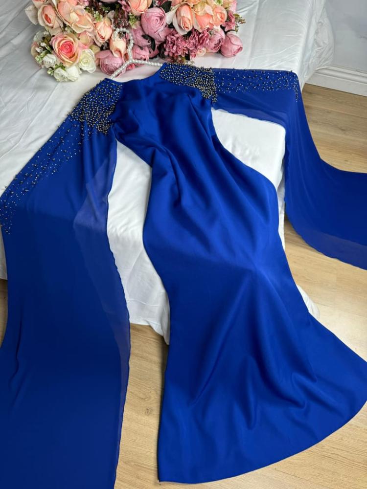 الوصف/ فستان سهره راقي يأتيكي باللون النيلي بتصميم راقي ليعطيكي منظرا جميلا