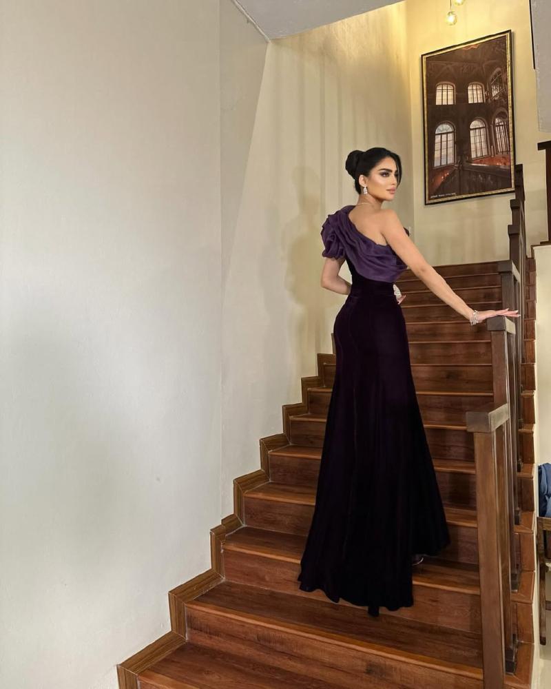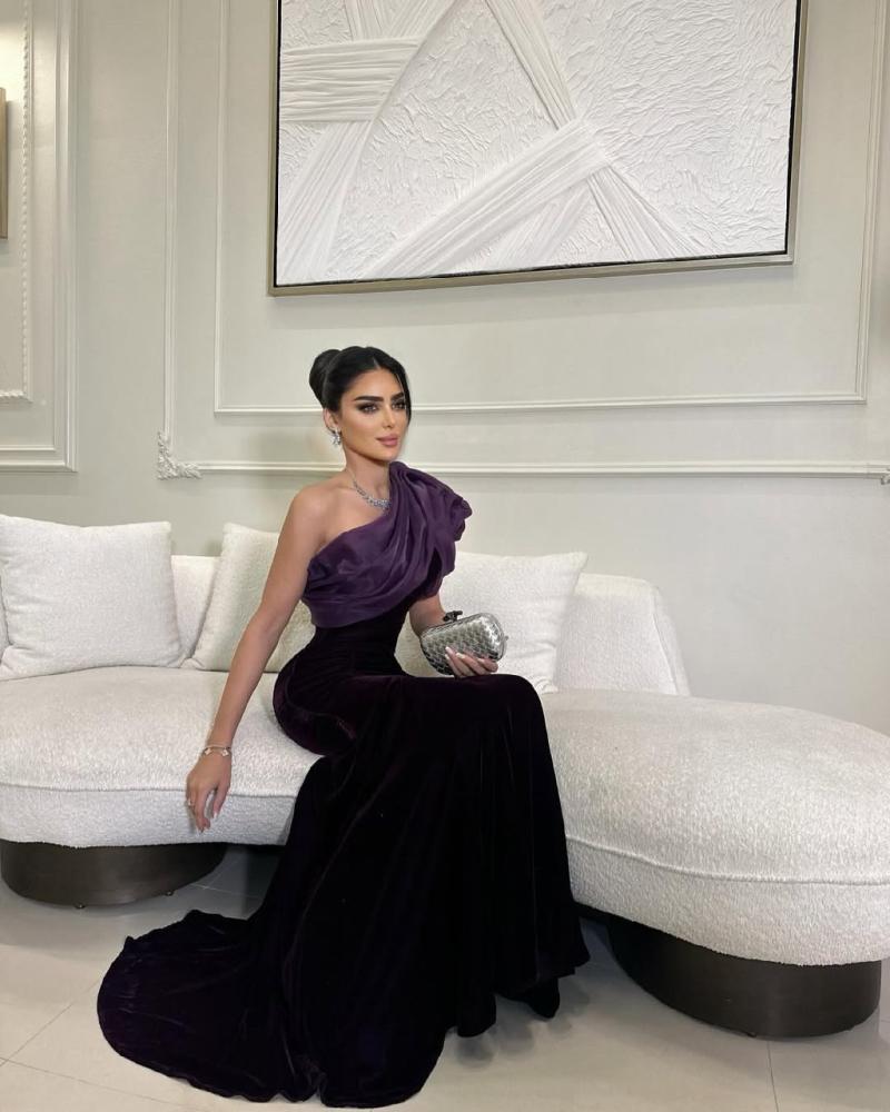 - التصميم: كتف واحد مكشوف لإطلالة عصرية.